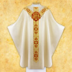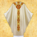 Haftowany ornat liturgiczny ecru z symbolem IHS łączy tradycyjne wzornictwo, nowoczesne tkaniny i duchową symbolikę, tworząc szatę, która doskonale sprawdzi się podczas Mszy Świętych, procesji i uroczystości parafialnych.