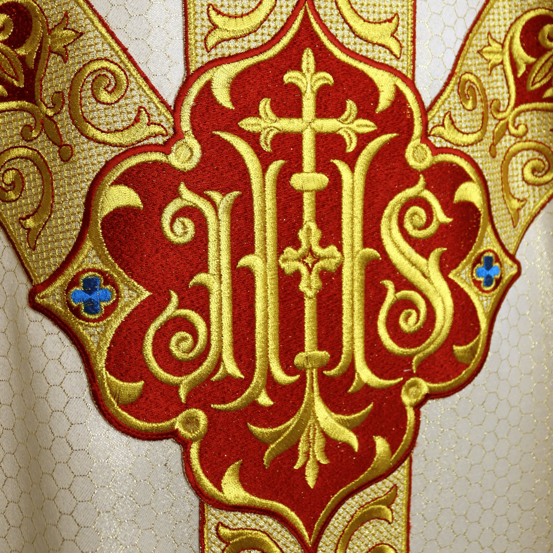 Haftowany ornat liturgiczny ecru z IHS, wykonany z tkaniny o strukturze plastra miodu „Favi”.