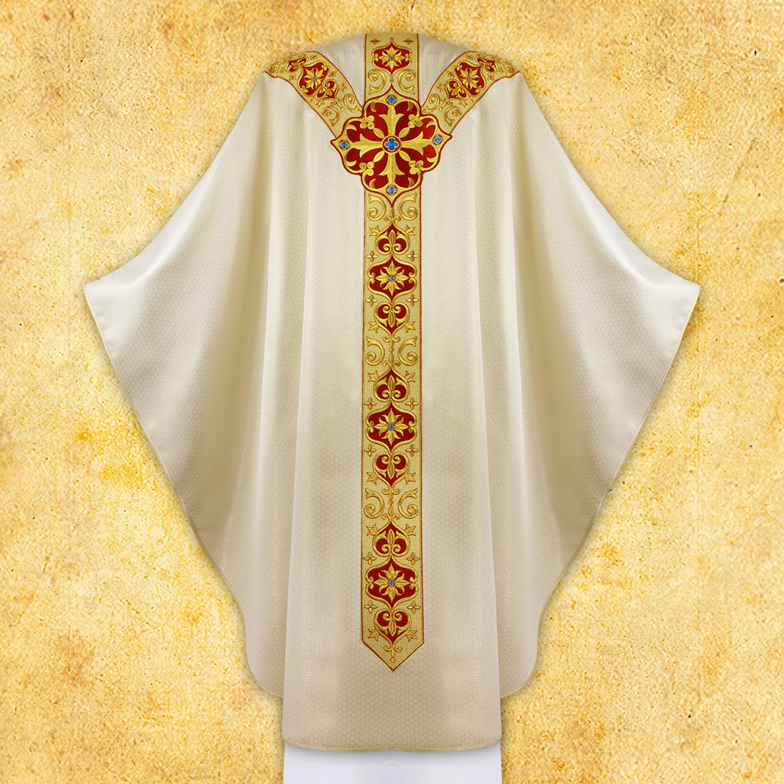 Uszyty z wysokogatunkowej tkaniny o strukturze plastra miodu (Favi), zachwyca subtelnym połyskiem i eleganckim układem, idealnym na uroczyste celebracje i procesje liturgiczne.