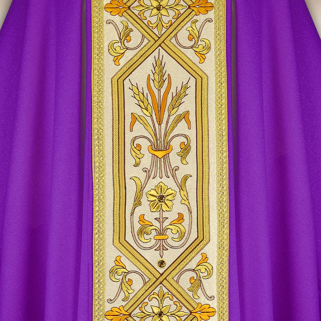 Centralny pas zdobi misterny motyw florystyczny, wykonany w duchu tradycyjnych wzorów sakralnych. Subtelna złota nić, w połączeniu z ręcznymi zdobieniami kamieniami, tworzy kompozycję pełną harmonii i szlachetnego blasku. Ornamenty w układzie symetrycznym przywołują motywy ofiary, wzrastania i piękna Bożego stworzenia, co nadaje szacie głębokie znaczenie liturgiczne. Całość została wykończona włoską plecioną pasmanterią w odcieniu starego złota, dodającą ornatowi wyjątkowego charakteru.