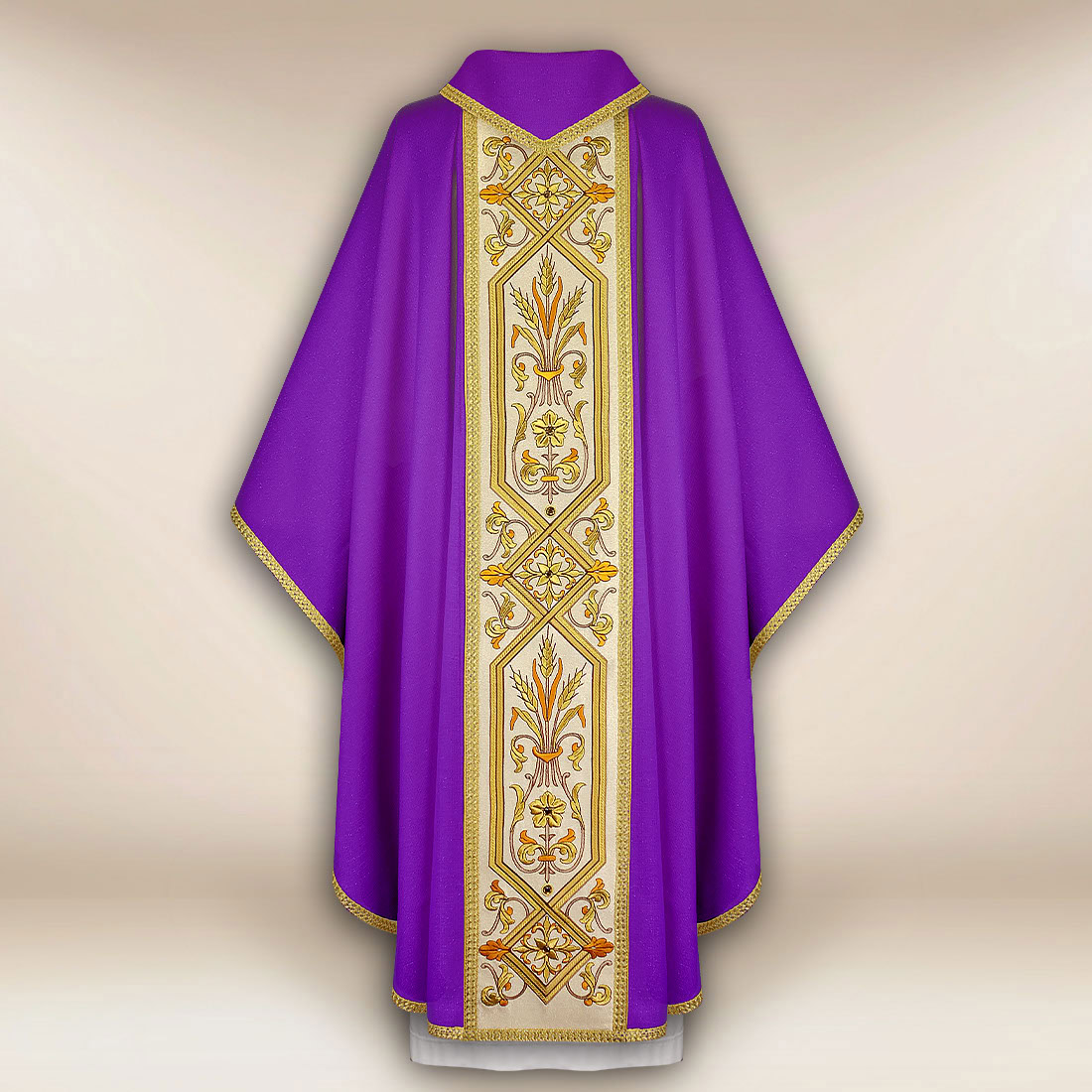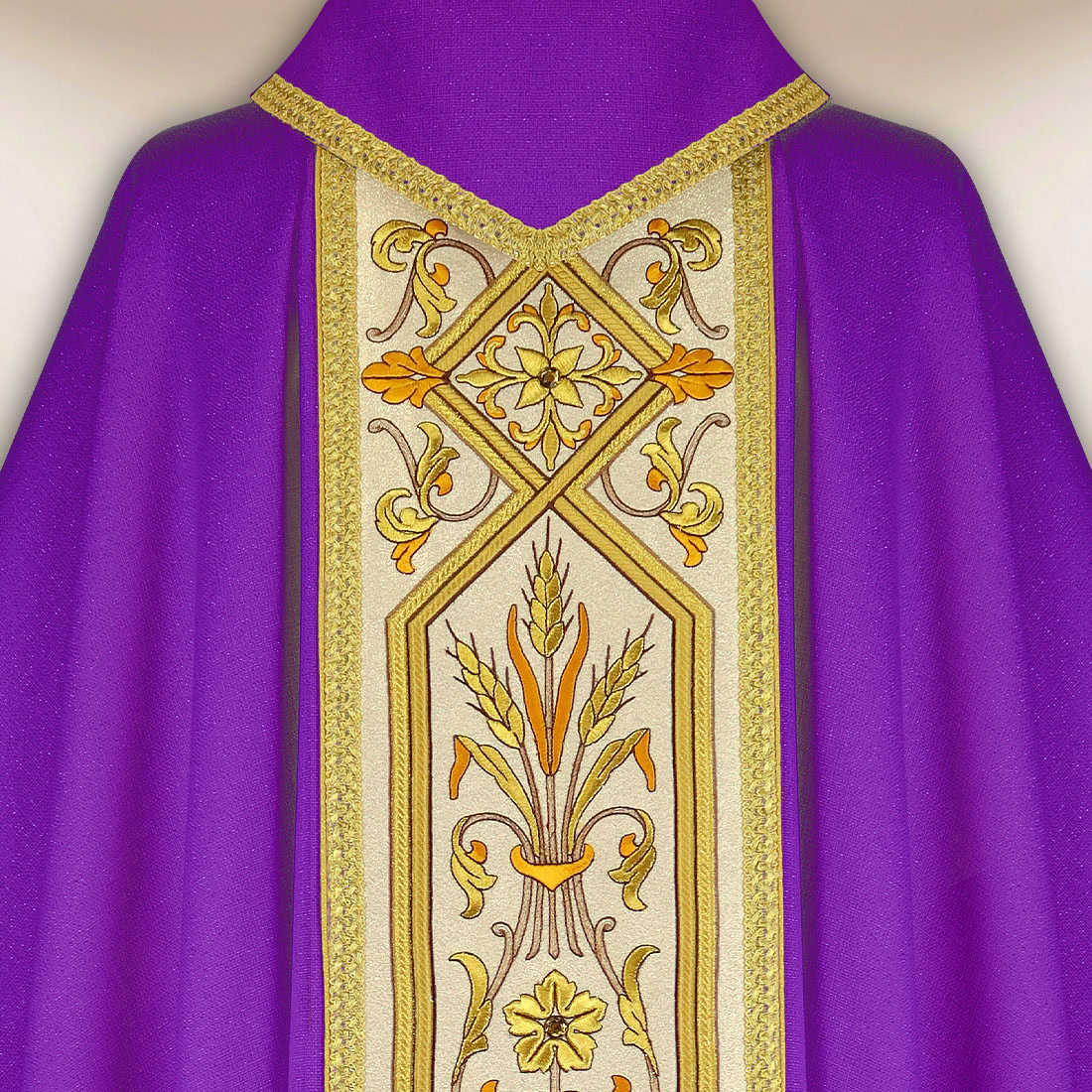Fioletowy ornat haftowany z pasem to ekskluzywna szata liturgiczna, zaprojektowana z myślą o uroczystych celebracjach wymagających wyjątkowej oprawy i głębokiej symboliki. Tkanina stanowi mieszankę włókien naturalnych (85% – wiskoza, len, jedwab) oraz syntetycznych (15% – poliester), co gwarantuje trwałość i elegancki wygląd. Materiał jest miękki, lekki i przyjemny w dotyku, dzięki czemu ornat układa się naturalnie i prezentuje niezwykle dostojnie podczas liturgii.