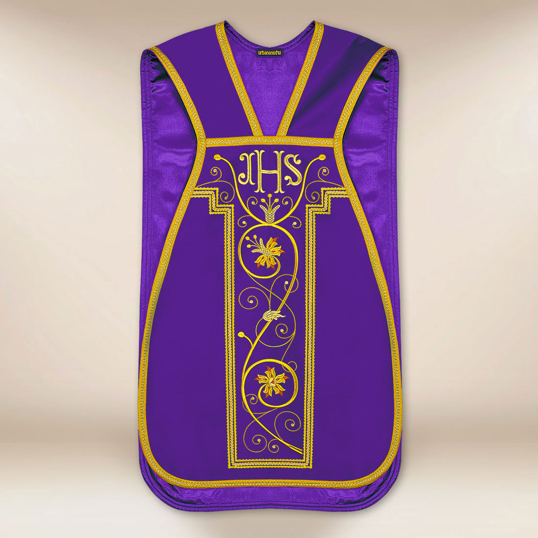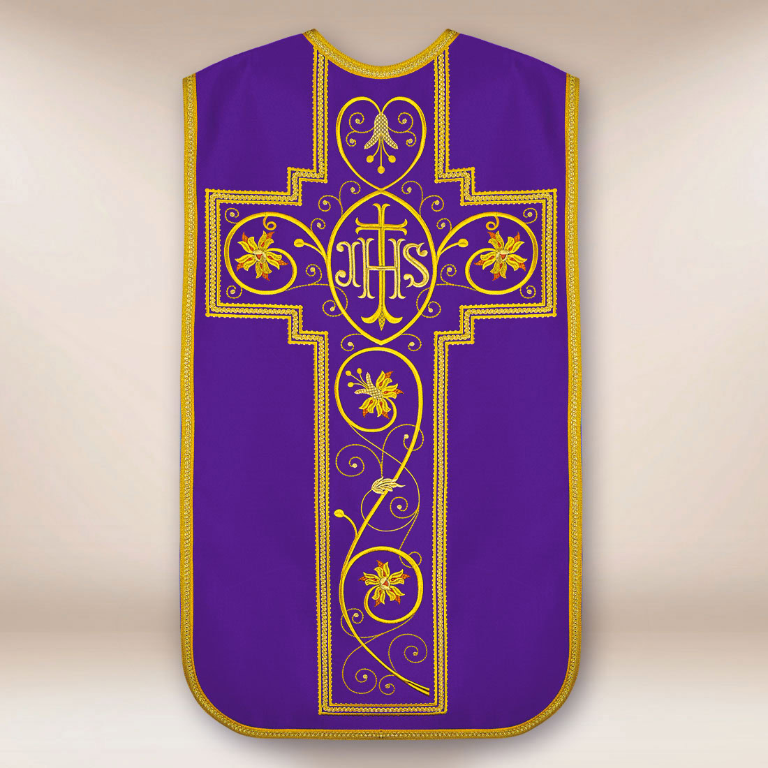 Ornat rzymski w kolorze fioletowym, ozdobiony złotym haftem krzyża i monogramem IHS.