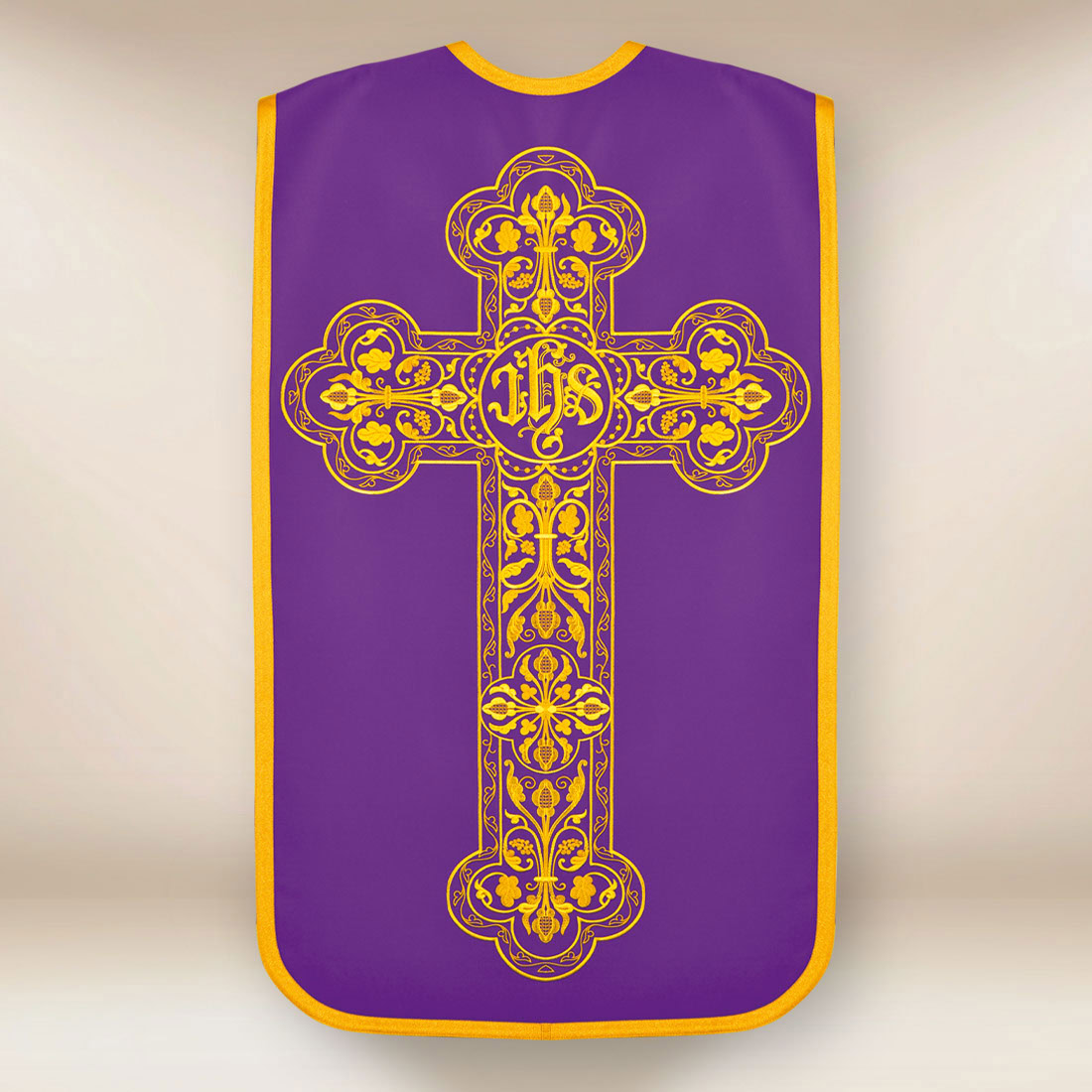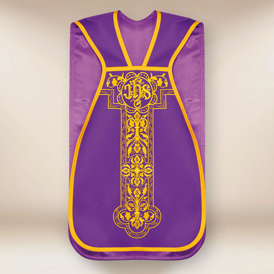 Fioletowa tonacja ornatu podkreśla jego przeznaczenie do liturgii Adwentu i Wielkiego Postu, nabożeństw pokutnych oraz celebracji o charakterze modlitewnego oczekiwania i refleksji. Barwa ta w naturalny sposób sprzyja skupieniu, ciszy i kontemplacji, harmonijnie współgrając z klasyczną formą kroju rzymskiego oraz spokojnym rytmem zdobień.