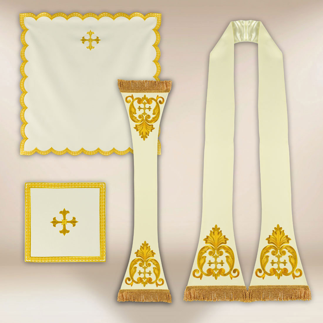 Całość tworzy kompletny zestaw liturgiczny zachowujący tradycję rytu rzymskiego, łącząc elegancję, piękno symboliki oraz dbałość o detal wykonania.