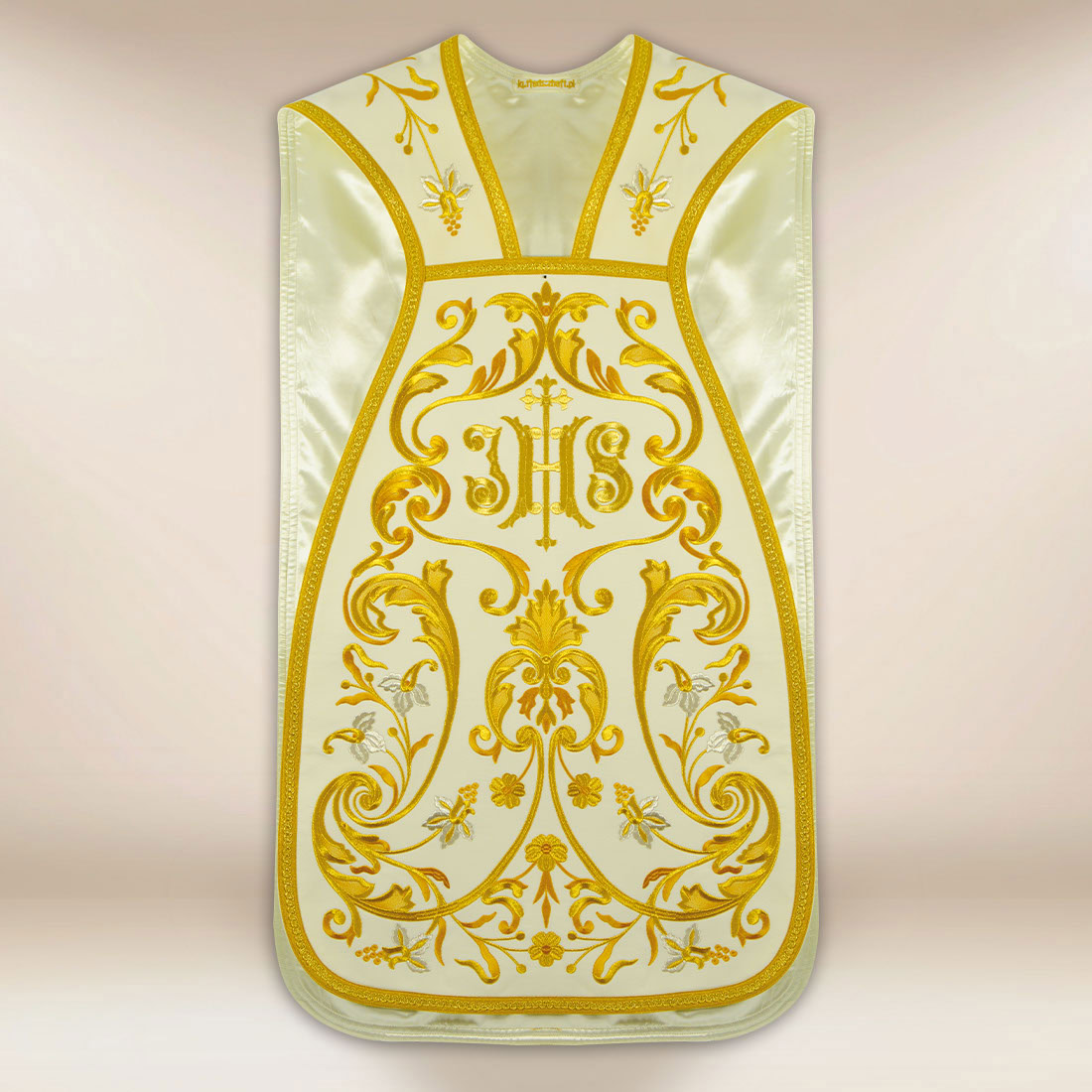 Komplet rzymski z IHS wykonany został z wysokogatunkowej tkaniny liturgicznej o gładkiej, delikatnej strukturze i subtelnym połysku. Materiał jest miękki, lekki i przyjemny w dotyku, dzięki czemu doskonale układa się na sylwetce podczas ruchu, nadając celebracji płynność i spójność. Tkanina prezentuje się szlachetnie zarówno w świetle prezbiterium, jak i przy większych uroczystościach, gdzie szczególnie istotne jest zachowanie równowagi między elegancją a powagą liturgiczną.