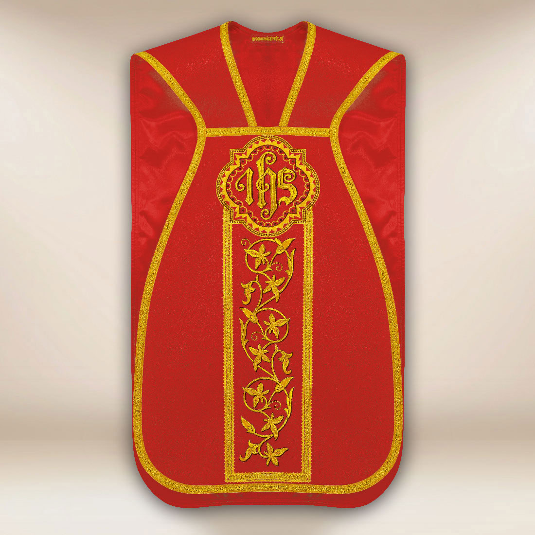Ornat rzymski w kolorze czerwonym, bogato haftowany złotym krzyżem i monogramem IHS, idealny na święta męczenników i Zesłanie Ducha Świętego.