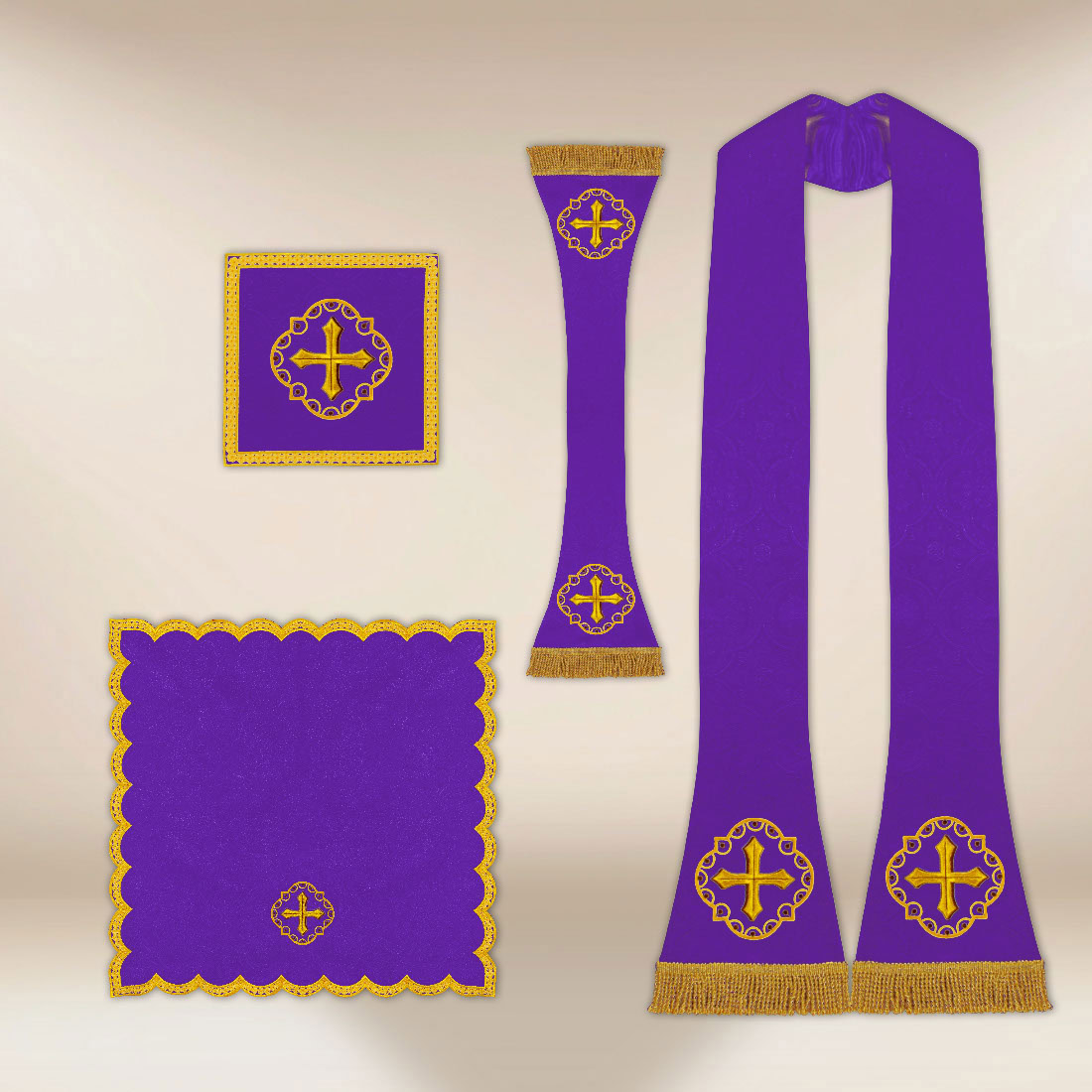 Komplet składa się z ornatu, stuły, manipularza, welonu i bursy.