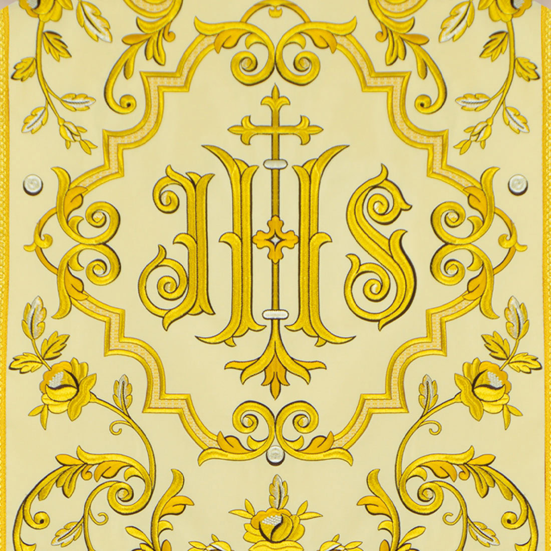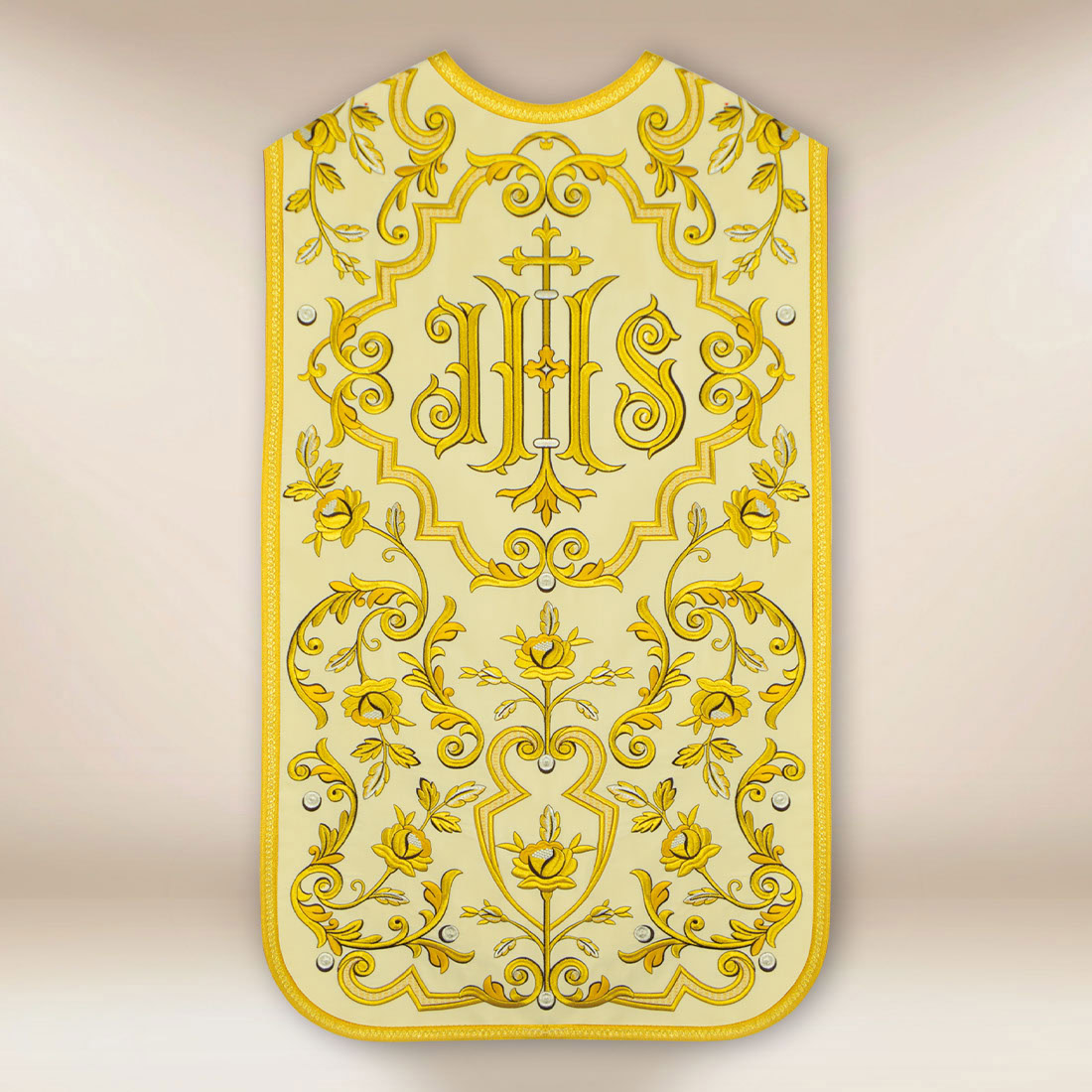 Rzymski ornat w jasnym kolorze, bogato haftowany złotym ornamentem i monogramem IHS. Idealny na uroczyste celebracje liturgiczne.
