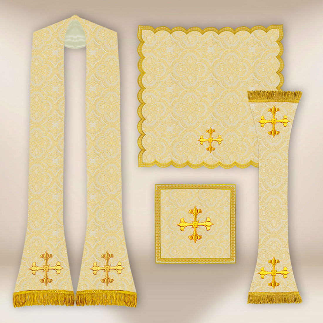 Komplet zawiera ornat, stułę, manipularz, welon i bursę.