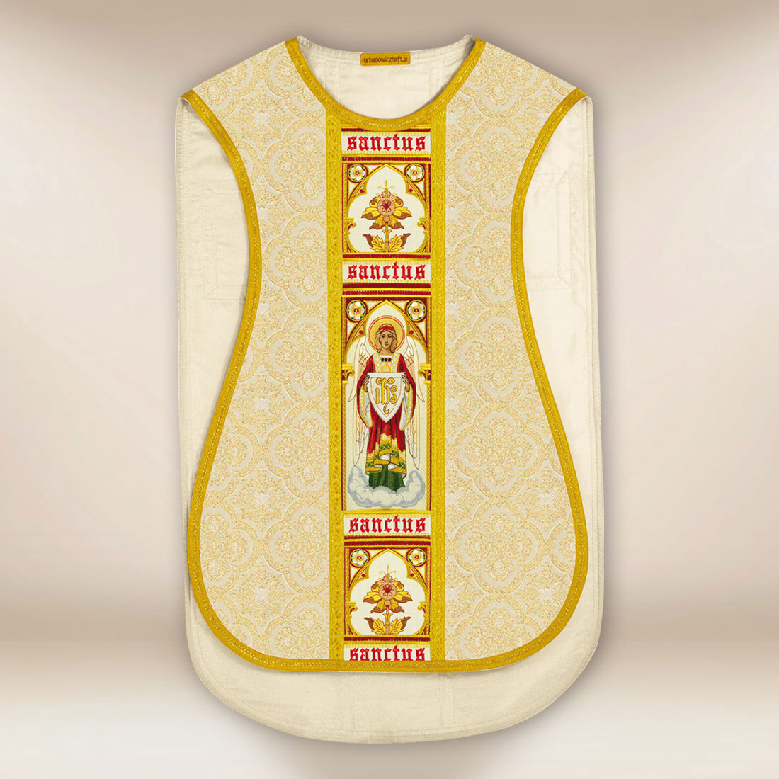Ornat rzymski z bogatym wizerunkiem Trójcy Świętej i złotym haftem. Uroczysty, elegancki i przeznaczony na celebracje świąteczne.