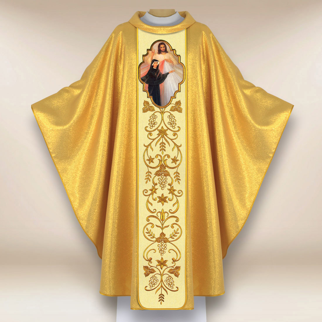 Ornat haftowany z wizerunkiem Jezusa Miłosiernego i św. Faustyny Kowalskiej to wyjątkowa szata liturgiczna, która podkreśla duchowy wymiar nabożeństw do Miłosierdzia Bożego. Centralne przedstawienie umieszczone na pasie dekoracyjnym nawiązuje do objawień, jakie Pan Jezus przekazał św. Faustynie, przypominając o słowach „Jezu, ufam Tobie” oraz o głębokim wezwaniu do ufności i modlitwy za świat.