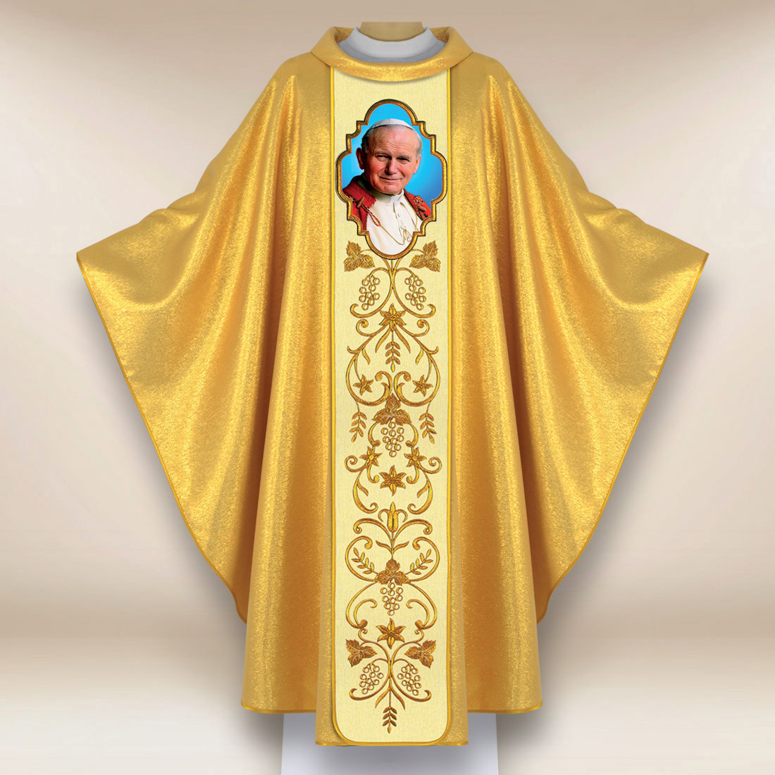 Ornat haftowany z wizerunkiem św. Jana Pawła II to szata liturgiczna o wyjątkowym charakterze, przeznaczona do uroczystych celebracji, świąt kościelnych, rocznic oraz nabożeństw związanych z Papieżem Polakiem. Centralnym elementem ornatu jest fotograficzny wizerunek Świętego, przedstawiony w pełnym pokoju i duchowej głębi, który stanowi zaproszenie do modlitwy, refleksji i zawierzenia Chrystusowi przez wstawiennictwo św. Jana Pawła II.