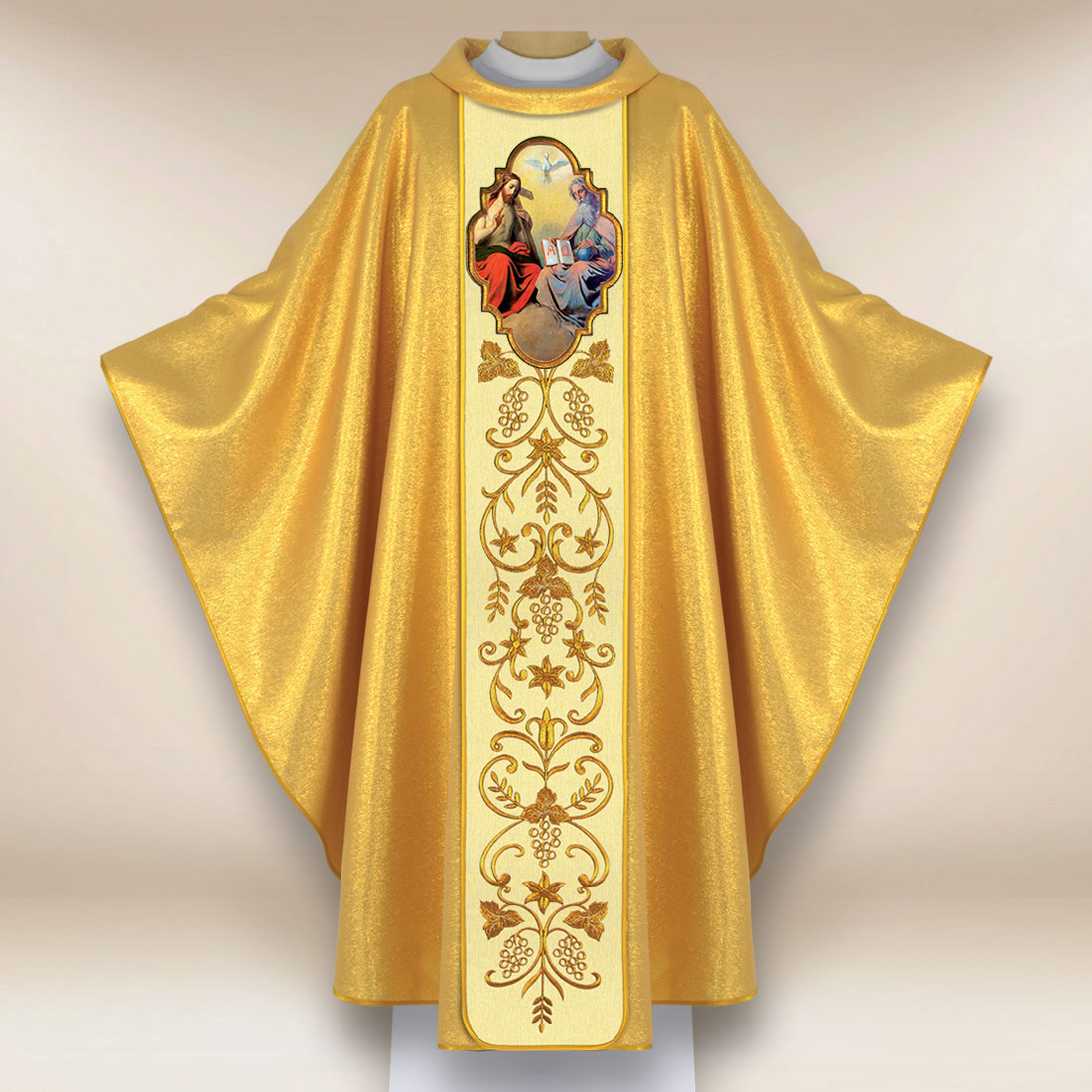 Ornat haftowany z wizerunkiem Trójcy Świętej to wyjątkowa szata liturgiczna o uroczystym charakterze, wykonana w odcieniu głębokiego złota – kolorze symbolizującym chwałę, majestat i obecność Boga. Centralne miejsce zajmuje fotograficzny wizerunek Trójcy Świętej, umieszczony na przednim pasie, który został dodatkowo ozdobiony bogatym haftem o motywach roślinnych w ciepłych, złotych tonach. Ornat Haftowany Z Wizerunkiem Fotograficznym “Trójca Święta” jest symbolem głębokiego oddania. Kompozycja ta podkreśla zarówno piękno treści teologicznej, jak i wysoką kulturę liturgiczną szaty.