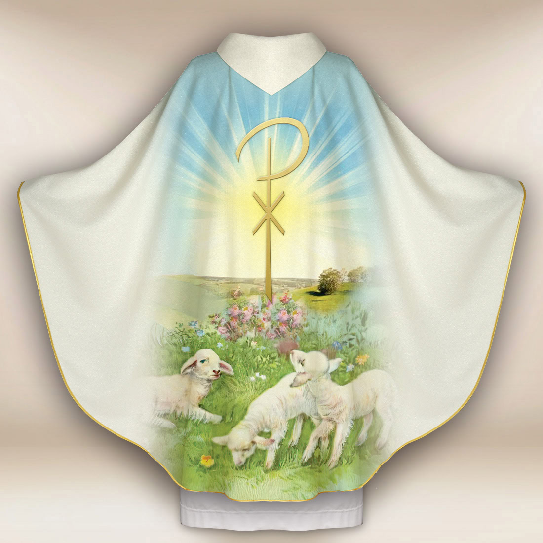 Ornat foto Jezus Zmartwychwstały to szata liturgiczna stworzona na celebracje Wielkiej Nocy, Rezurekcji oraz Mszy Paschalnych. Centralny motyw ukazuje pełnego majestatu Jezusa Zmartwychwstałego, trzymającego paschalny sztandar – znak zwycięstwa nad śmiercią. Z tyłu widnieją Baranki, symbol odkupienia i pokoju, który nadaje całej kompozycji delikatny, teologiczny wymiar.
