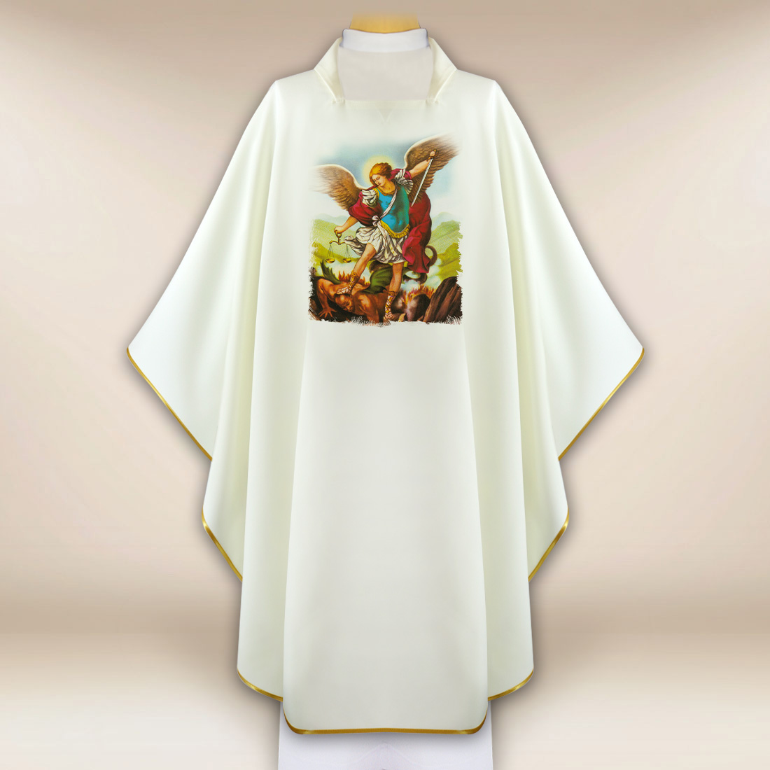 Prezentowany Ornat z Michałem Archaniołem to wyjątkowa szata liturgiczna, łącząca głęboką symbolikę chrześcijańską z nowoczesną technologią wykonania. Centralnym elementem ornatu jest fotograficzny wizerunek św. Michała Archanioła – potężnego obrońcy wiary, zwycięzcy zła i patrona Kościoła walczącego. Postać Archanioła, ukazana z niezwykłą dbałością o detale, podkreśla podniosły charakter liturgii oraz nadaje celebracji wyjątkową oprawę duchową.