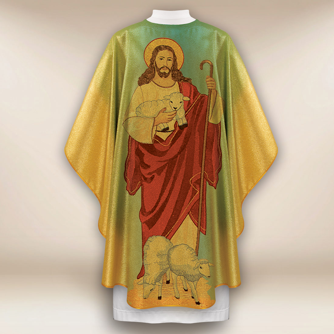 Ten ornat złoty brokat z wizerunkiem Dobrego Pasterza doskonale sprawdzi się podczas uroczystych Mszy Świętych, nabożeństw tematycznych, rekolekcji oraz świąt o szczególnym charakterze duszpasterskim.