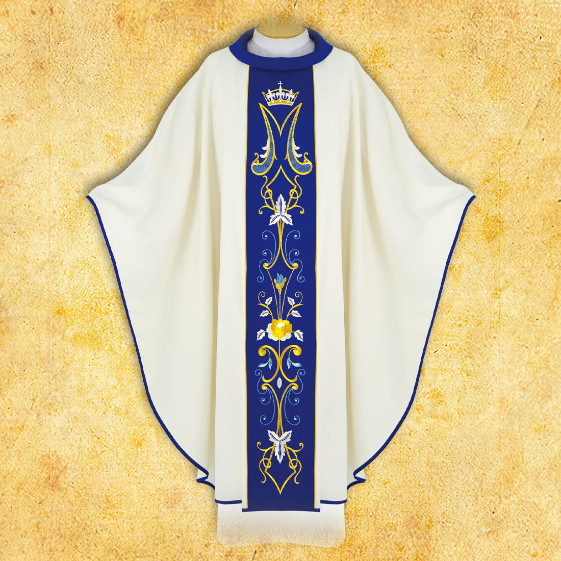 Ornat Maryjny to elegancka i symboliczna szata liturgiczna dedykowana uroczystościom i nabożeństwom ku czci Matki Bożej. Dominująca biel nawiązuje do czystości, światła i duchowej bliskości z Bogurodzicą, natomiast pas w odcieniu głębokiego błękitu podkreśla jej królewski majestat oraz szczególną rolę w historii zbawienia. Haftowane motywy kwiatowe, lilia – symbol czystości, oraz złota korona nad monogramem Maryi tworzą spójną i pełną godności kompozycję.