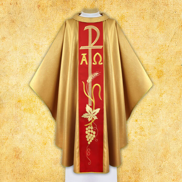 Ornat liturgiczny wykonany z eleganckiej, złotej tkaniny o subtelnym brokatowym połysku, który nadaje całości wyjątkowej głębi i blasku. Centralny pas w kolorze czerwonym zdobi precyzyjnie haftowany złotą nicią symbol Alfa i Omega wraz z kłosem zboża oraz winogronem.