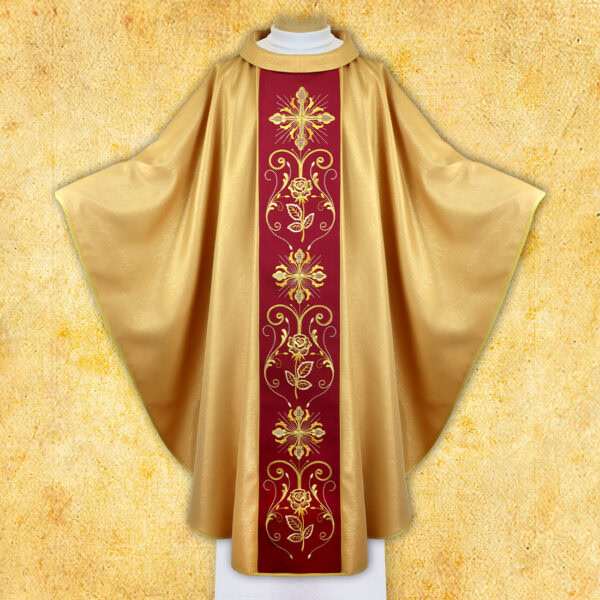Ornat liturgiczny wykonany z eleganckiej, złotej tkaniny o subtelnym, brokatowym połysku, który pięknie odbija światło i podkreśla uroczysty charakter celebracji. Centralny pas w kolorze głębokiego bordo zdobi bogaty haft wykonany złotą nicią, przedstawiający motyw krzyża, róż i ornamentów roślinnych – symbolizujących chwałę, ofiarę i piękno liturgii.