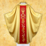 Ornat liturgiczny wykonany z eleganckiej, złotej tkaniny o subtelnym wzorze w krzyżyki. Środek zdobi bogato haftowany pas w kolorze głębokiej czerwieni, na którym złotą nicią wyszyto motyw kielicha eucharystycznego, winogron i kłosów zboża – symbolizujących Ciało i Krew Chrystusa.