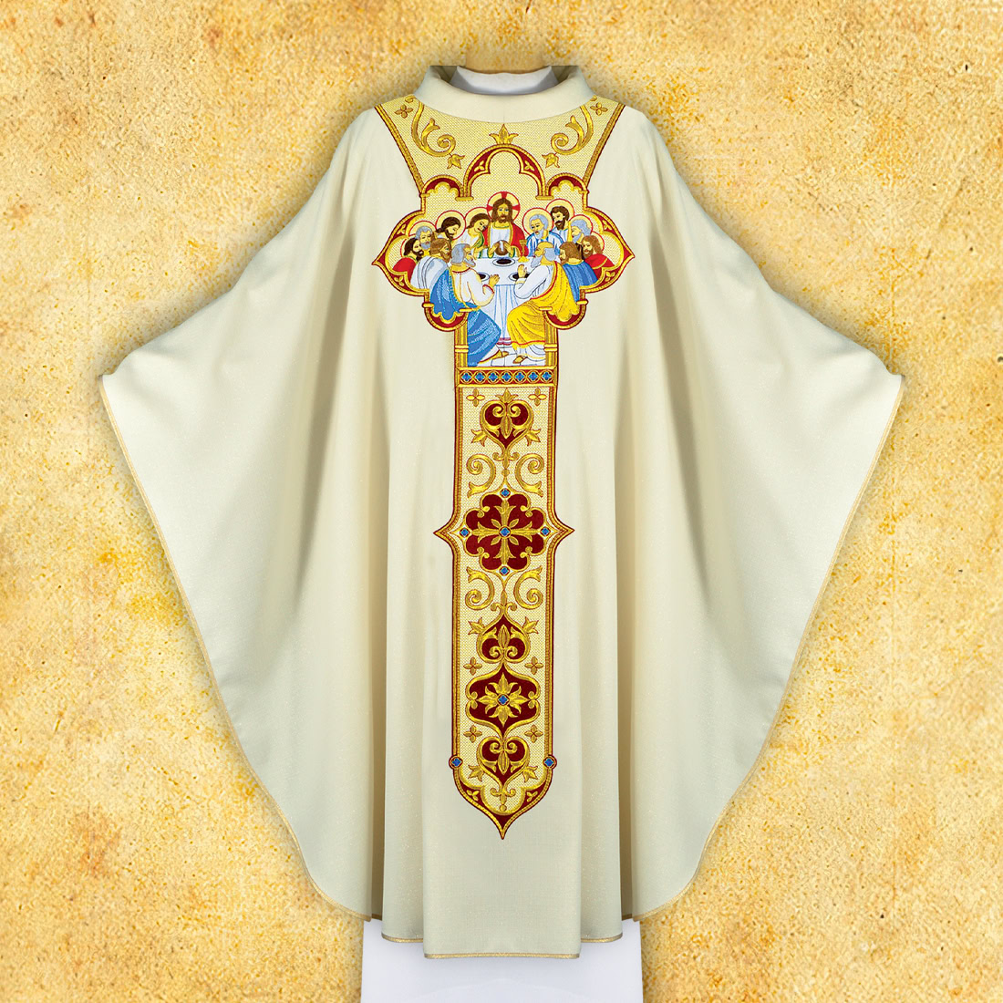 Ornat liturgiczny wykonany z ekskluzywnej tkaniny „Sacroline” w kolorze ecru, delikatnie przeplatanej złotą nicią.