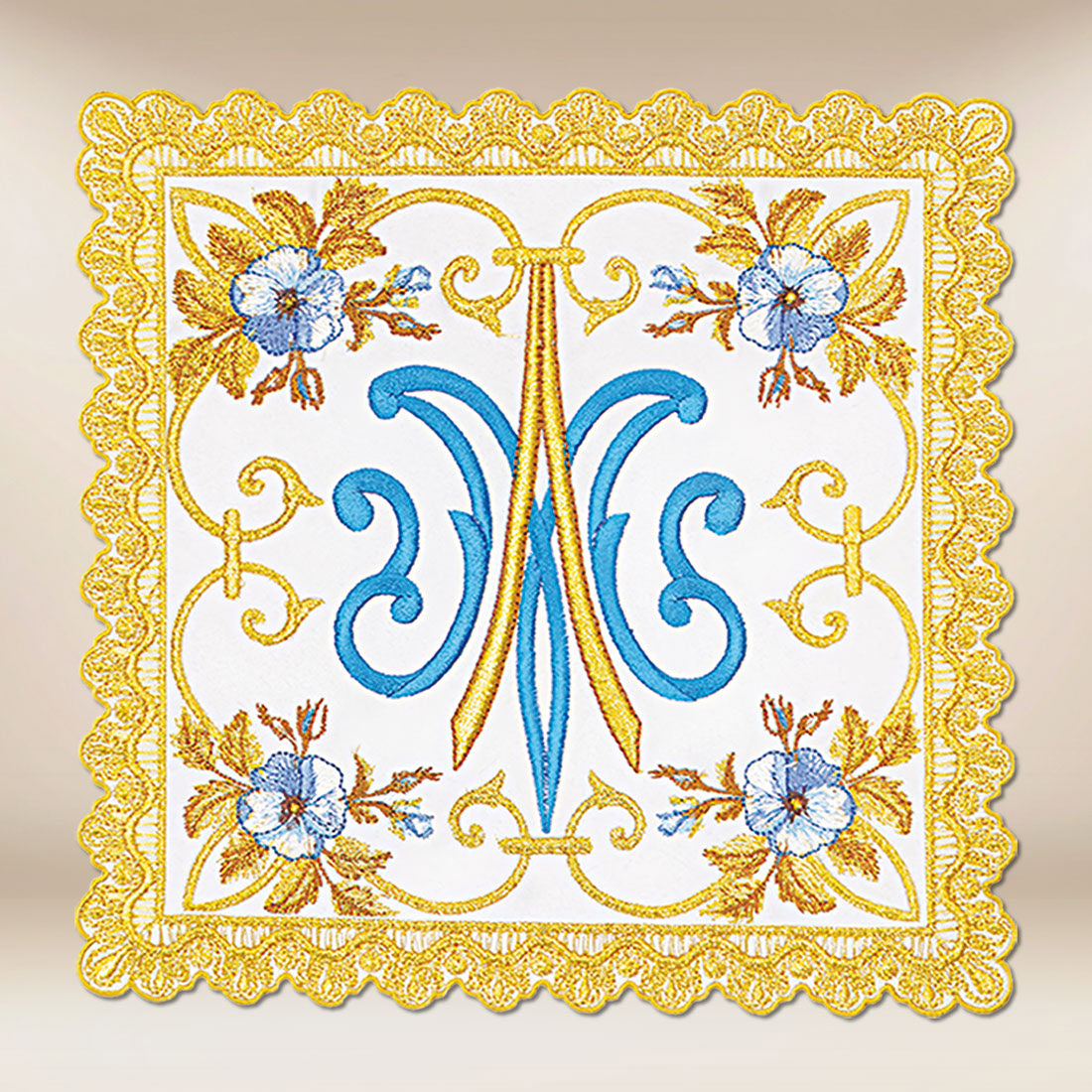 Palka bogato haftowana złotą nicią to wyjątkowy element bielizny kielichowej, który łączy piękno tradycyjnego haftu z głęboką symboliką maryjną. Centralny motyw zdobi litera „M” w kolorze błękitnym – symbol Matki Bożej – otoczona złotymi ornamentami i delikatnymi kwiatami w odcieniach niebieskiego i złota. Całość tworzy harmonijną, elegancką kompozycję, która w sposób subtelny nawiązuje do czystości, pokory i duchowego piękna Maryi.