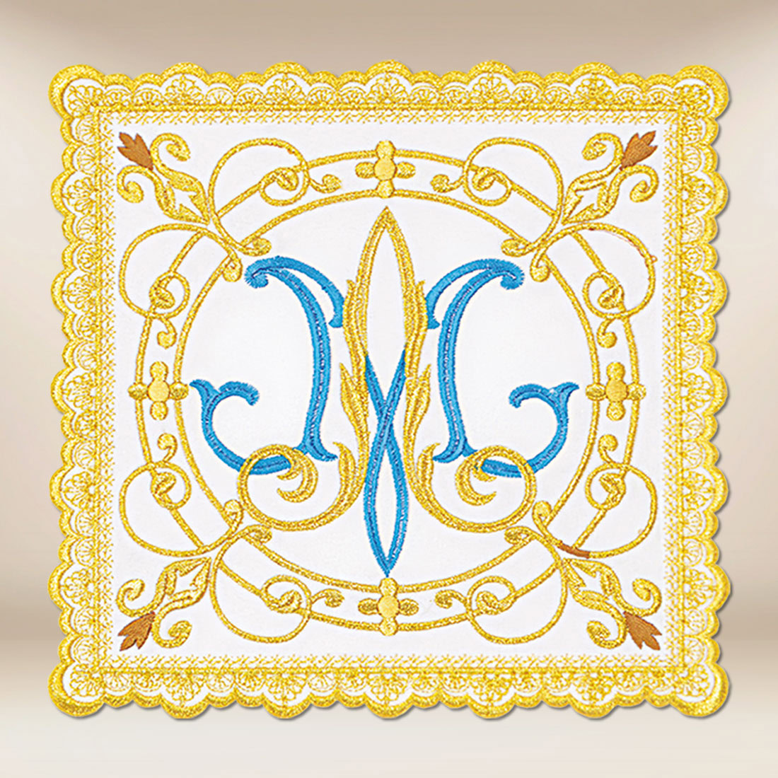 Palka bogato haftowana złotą nicią to niezwykle elegancki element bielizny kielichowej, stworzony z myślą o uroczystych celebracjach maryjnych. W centrum kompozycji znajduje się litera „M” – symbol Matki Bożej – wykonana błękitną nicią, otoczona złotymi ornamentami roślinnymi o delikatnie barokowym charakterze. Całość haftu emanuje harmonią, pięknem i duchowym spokojem, tworząc wyjątkową ozdobę ołtarza.
