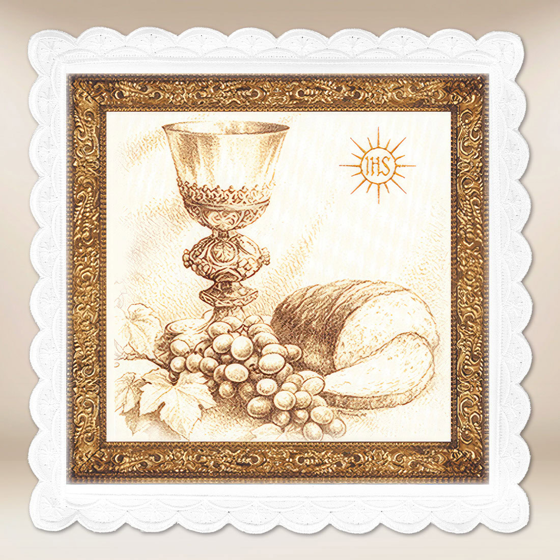 Palka fotograficzna przedstawia klasyczną, sepia-tonowaną kompozycję z symbolami Eucharystii – kielichem, chlebem i winogronami. W górnej części widnieje monogram IHS, stanowiący skrót od imienia Jezus, otoczony złocistymi promieniami światła. Subtelne cieniowanie i artystyczny styl rysunku nadają całej scenie wyjątkowy, sakralny charakter, nawiązujący do tradycyjnych przedstawień eucharystycznych obecnych w sztuce kościelnej. Ciepła, złoto-brązowa kolorystyka podkreśla duchową głębię motywu, a elegancka ramka dodaje całości wrażenia ikony.