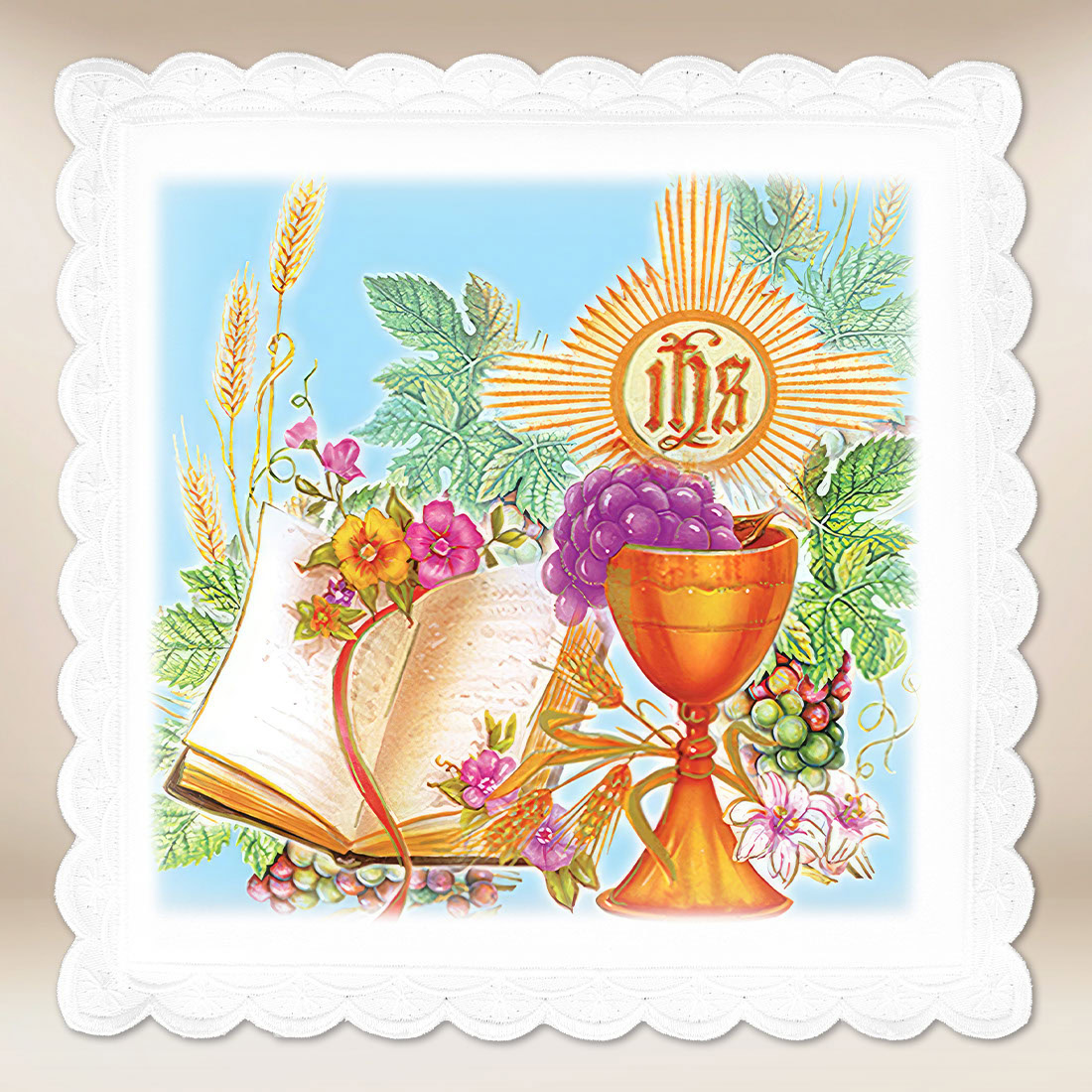Centralnym motywem dekoracyjnym jest monogram IHS, umieszczony na promienistej glorii, będący skrótem imienia Jezus i jednym z najważniejszych symboli eucharystycznych Kościoła. Towarzyszą mu kielich eucharystyczny, winogrona oraz kłosy zboża, które jednoznacznie odsyłają do chleba i wina – znaków Ciała i Krwi Chrystusa. Uzupełnieniem kompozycji jest otwarta księga, symbolizująca Słowo Boże, oraz delikatne motywy roślinne podkreślające duchowy wymiar przedstawienia. Całość tworzy spójną, czytelną ikonografię Eucharystii.