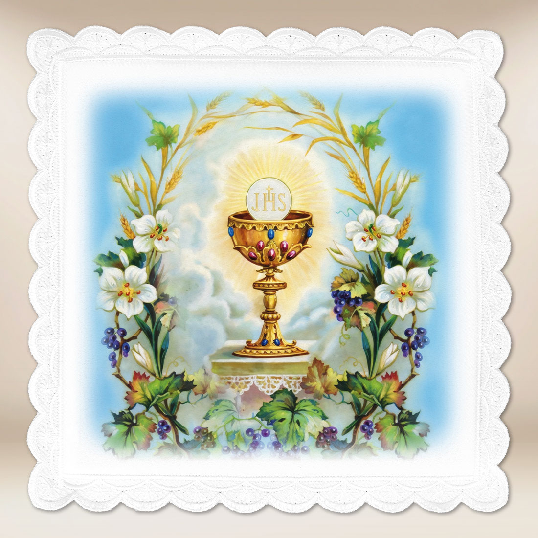 Palka fotograficzna to wyjątkowy element bielizny kielichowej, ozdobiony artystycznym motywem eucharystycznym przedstawiającym kielich z Hostią w otoczeniu lilii, kłosów zbóż i winnych gron. Kompozycja utrzymana w delikatnych barwach błękitu, złota i zieleni symbolizuje czystość, ofiarę i duchową pełnię, idealnie wpisując się w sakralny charakter liturgii.