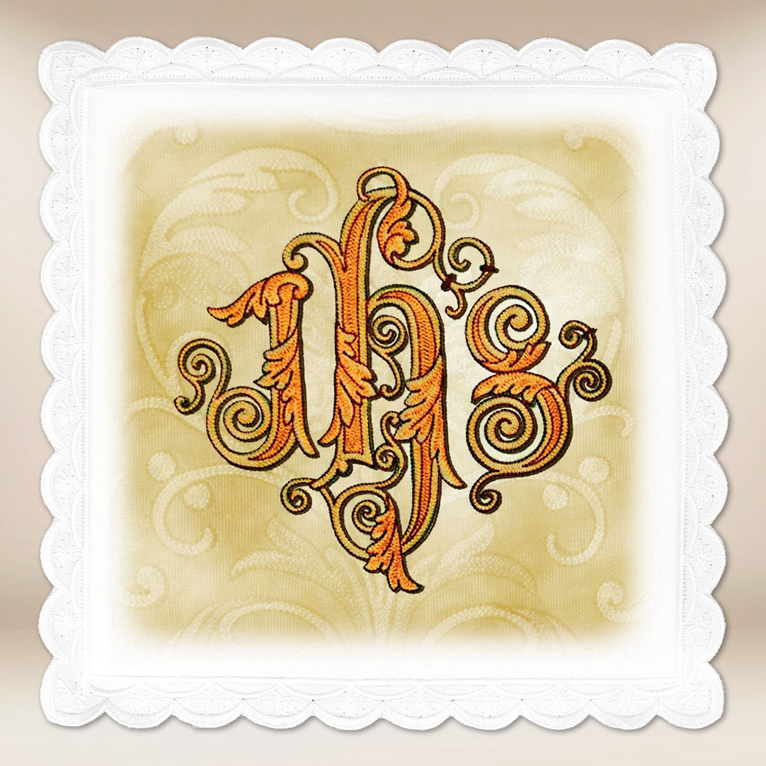 Palka fotograficzna to elegancki element bielizny kielichowej, ozdobiony klasycznym monogramem IHS, będącym jednym z najstarszych chrystogramów symbolizujących imię Jezusa Chrystusa. Zdobienie w odcieniach złota i brązu nadaje pallce wyjątkowego blasku, łącząc tradycję z ponadczasową estetyką liturgiczną. Subtelne tło z ornamentem roślinnym podkreśla duchowy wymiar kompozycji, czyniąc z niej piękny akcent każdej celebracji Eucharystycznej.
