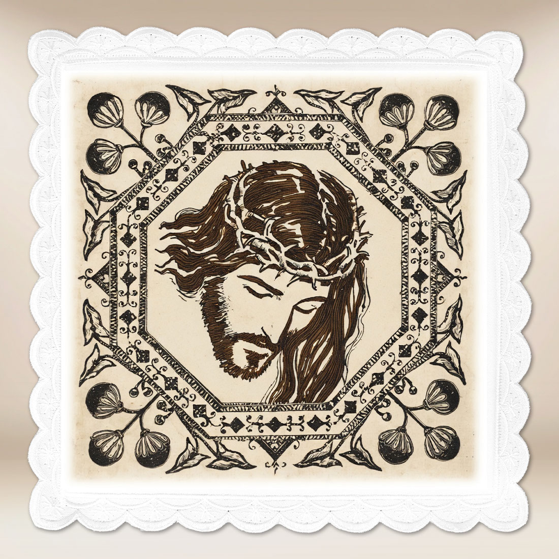 Palka fotograficzna to niezwykle poruszający element bielizny kielichowej, przedstawiający wizerunek Jezusa Chrystusa w koronie cierniowej. Obraz ten, utrzymany w klasycznej tonacji brązów i beży, emanuje głębią duchową i skupieniem, przypominając o tajemnicy Męki Pańskiej oraz bezgranicznej miłości Zbawiciela. Ramę kompozycji zdobią ornamenty roślinne i motywy symboliczne, które nadają całości wyjątkowego, sakralnego charakteru.