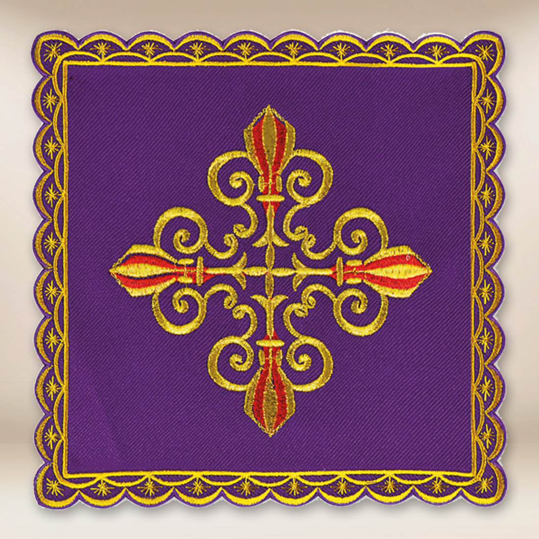 Palka haftowana fioletowa to elegancki element bielizny kielichowej, wykonany z wysokiej jakości tkaniny liturgicznej w głębokim kolorze fioletu. Zdobiona precyzyjnym złoto-czerwonym haftem w formie stylizowanego krzyża, symbolizuje wiarę, pokutę i duchowe odrodzenie. Subtelny połysk nici podkreśla uroczysty charakter liturgii i dodaje kompozycji wyjątkowej głębi.