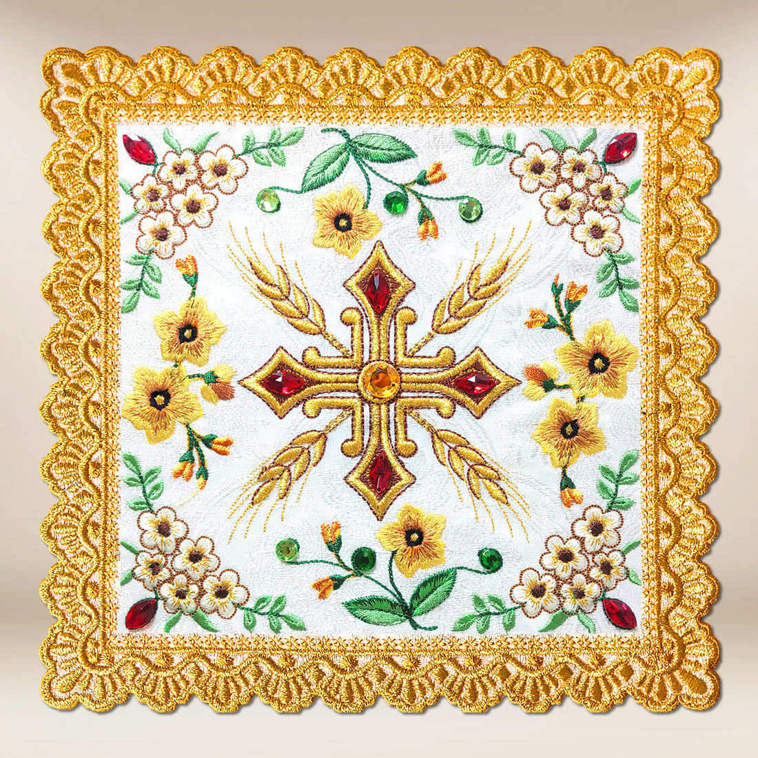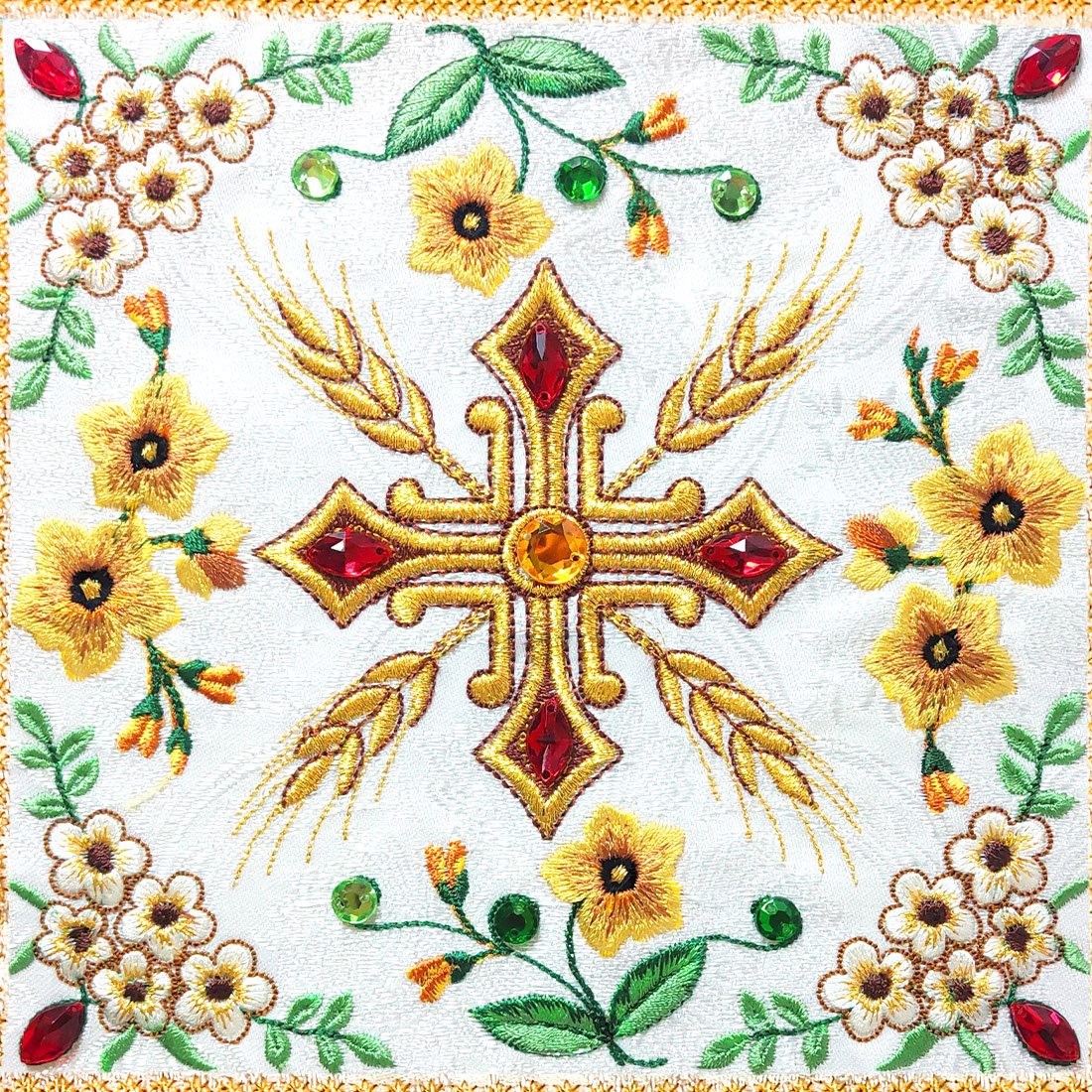 Palka haftowana Krzyż „Pretiosus” to wyjątkowy przykład kunsztu hafciarskiego, łączący duchowe piękno z artystycznym rzemiosłem. W centrum kompozycji znajduje się złoto-czerwony krzyż, symbol wiary i odkupienia, otoczony delikatnymi kwiatami w odcieniach żółci i kremu oraz motywami kłosów zbóż i zielonych liści. Ta bogata, a zarazem harmonijna kompozycja symbolizuje życie, ofiarę i Eucharystię.