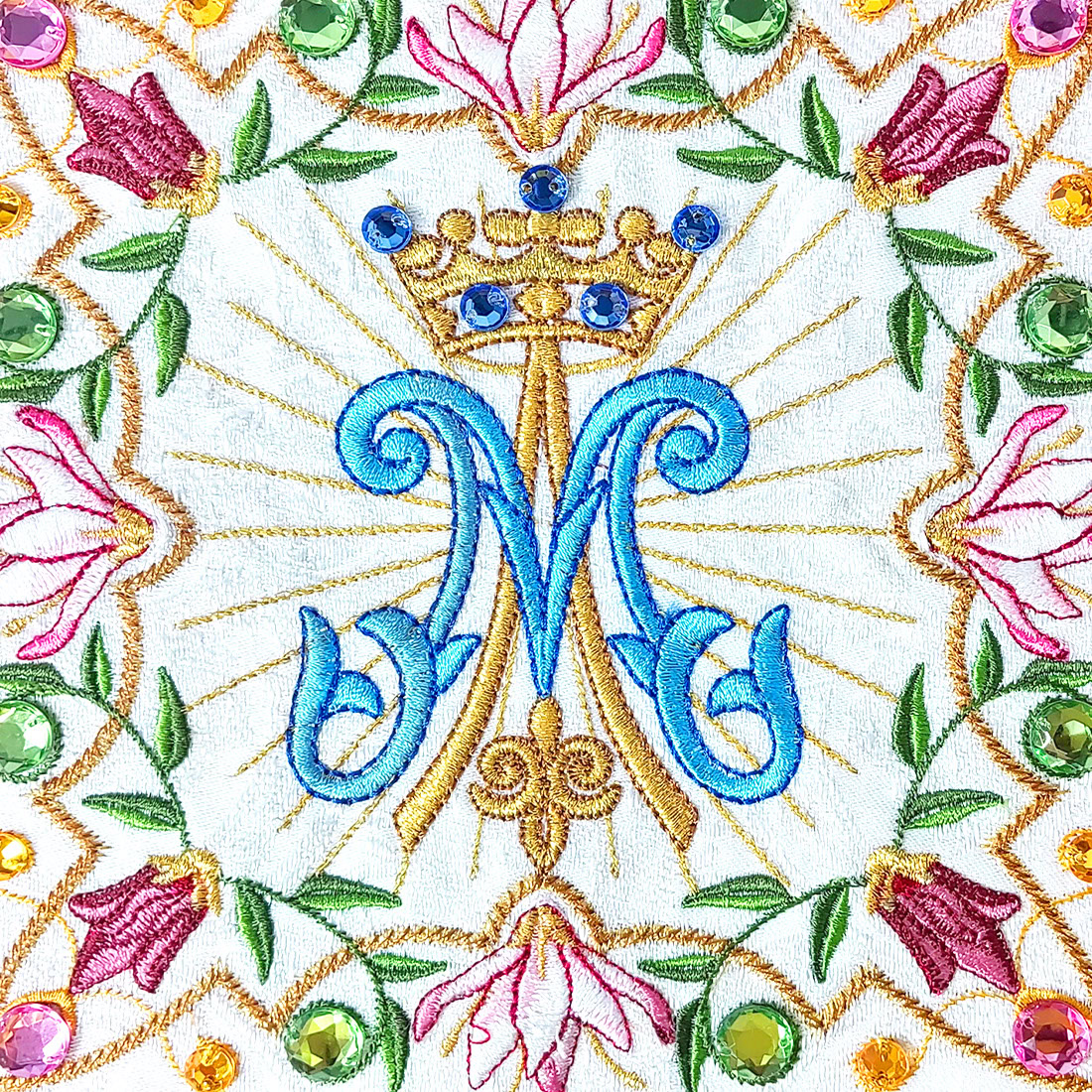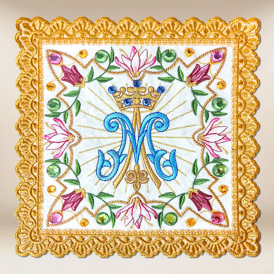 Palka haftowana maryjna „Pretiosus” to elegancki element bielizny kielichowej o wyjątkowym, maryjnym charakterze. W centrum kompozycji znajduje się niebieski monogram „M” zwieńczony koroną, symbolizujący Najświętszą Maryję Pannę – Królową Nieba. Wokół motywu głównego rozpościerają się promienie światła oraz kwiaty lilii i róż, które w tradycji chrześcijańskiej oznaczają czystość, piękno i duchową doskonałość.