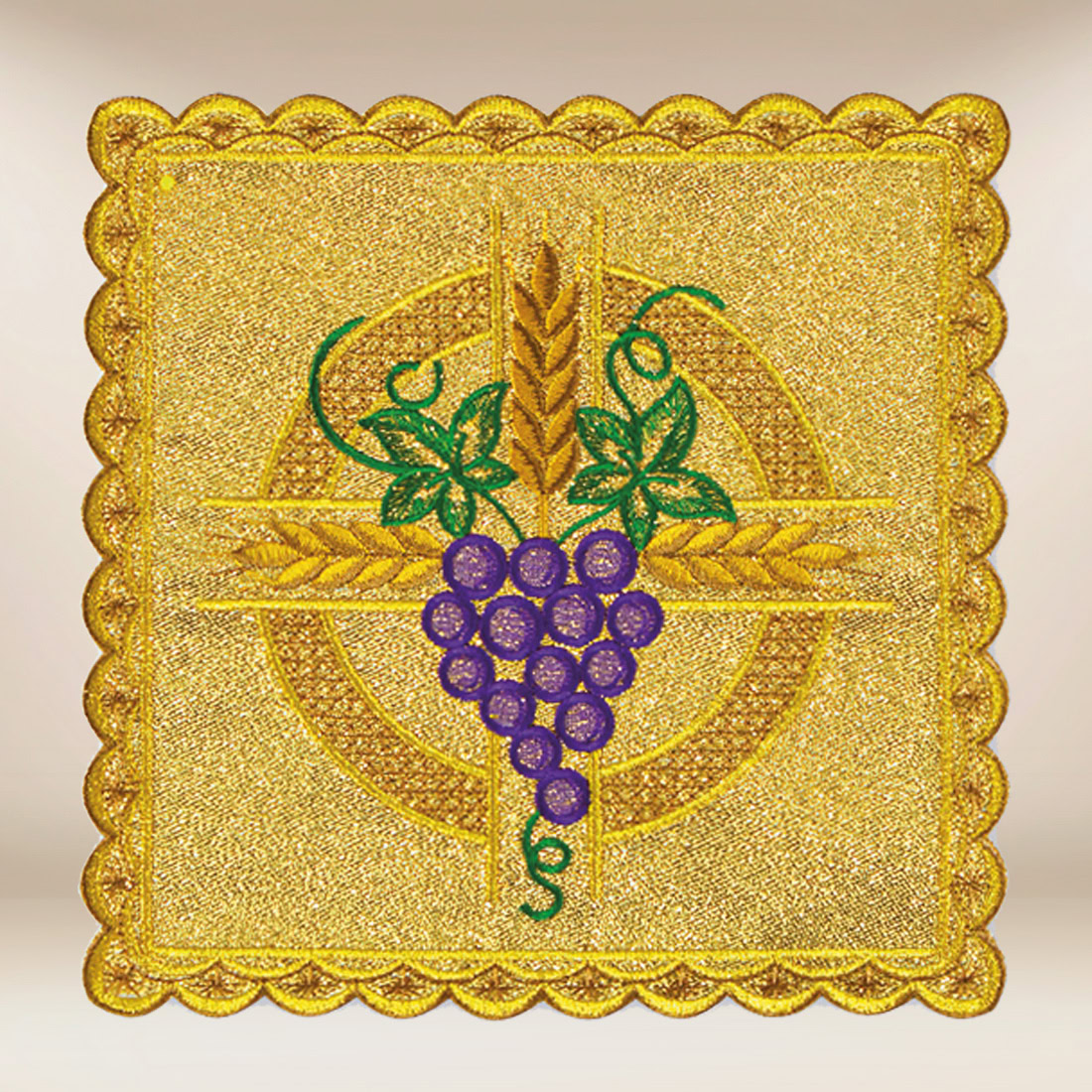Palka haftowana złota to wyjątkowy element bielizny kielichowej, wykonany z wysokiej jakości tkaniny liturgicznej w kolorze złotym. Zdobiona misternym haftem przedstawiającym krzyż, winogrona i kłosy zboża, symbolizuje Eucharystię – Ciało i Krew Chrystusa, a także duchową jedność wiernych z Bogiem.
