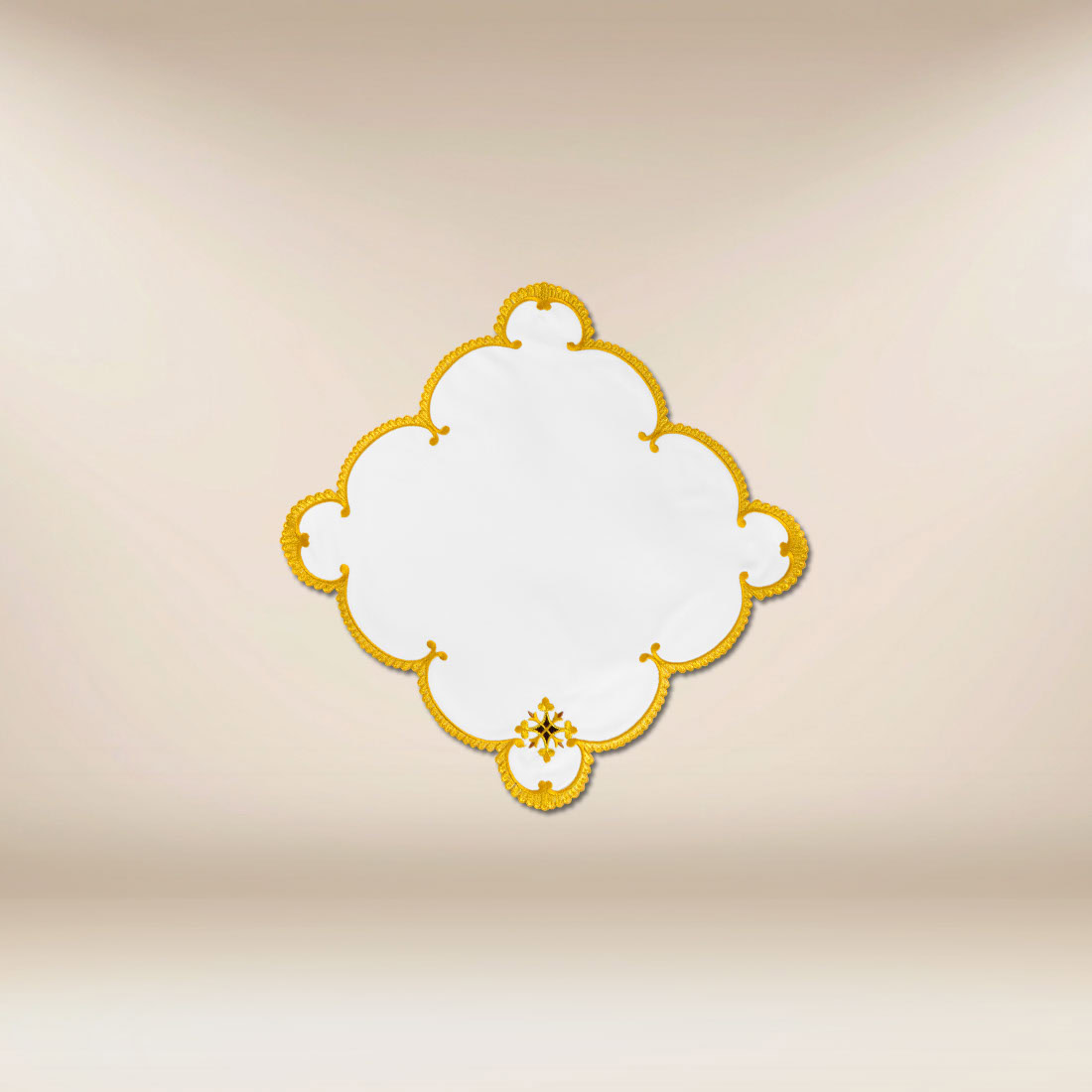 Produkt wykonany został z wysokiej jakości tkaniny poliestrowej, impregnowanej i plamoodpornej, co zapewnia trwałość oraz wygodę użytkowania w warunkach liturgicznych. Precyzyjnie opracowany haft podkreśla dbałość o detale i estetykę wykończenia, dzięki czemu serwetka zachowuje swój elegancki wygląd przez długi czas. Rozmiar 32×32 cm sprawia, że jest to praktyczny i uniwersalny dodatek do wystroju ołtarza.
