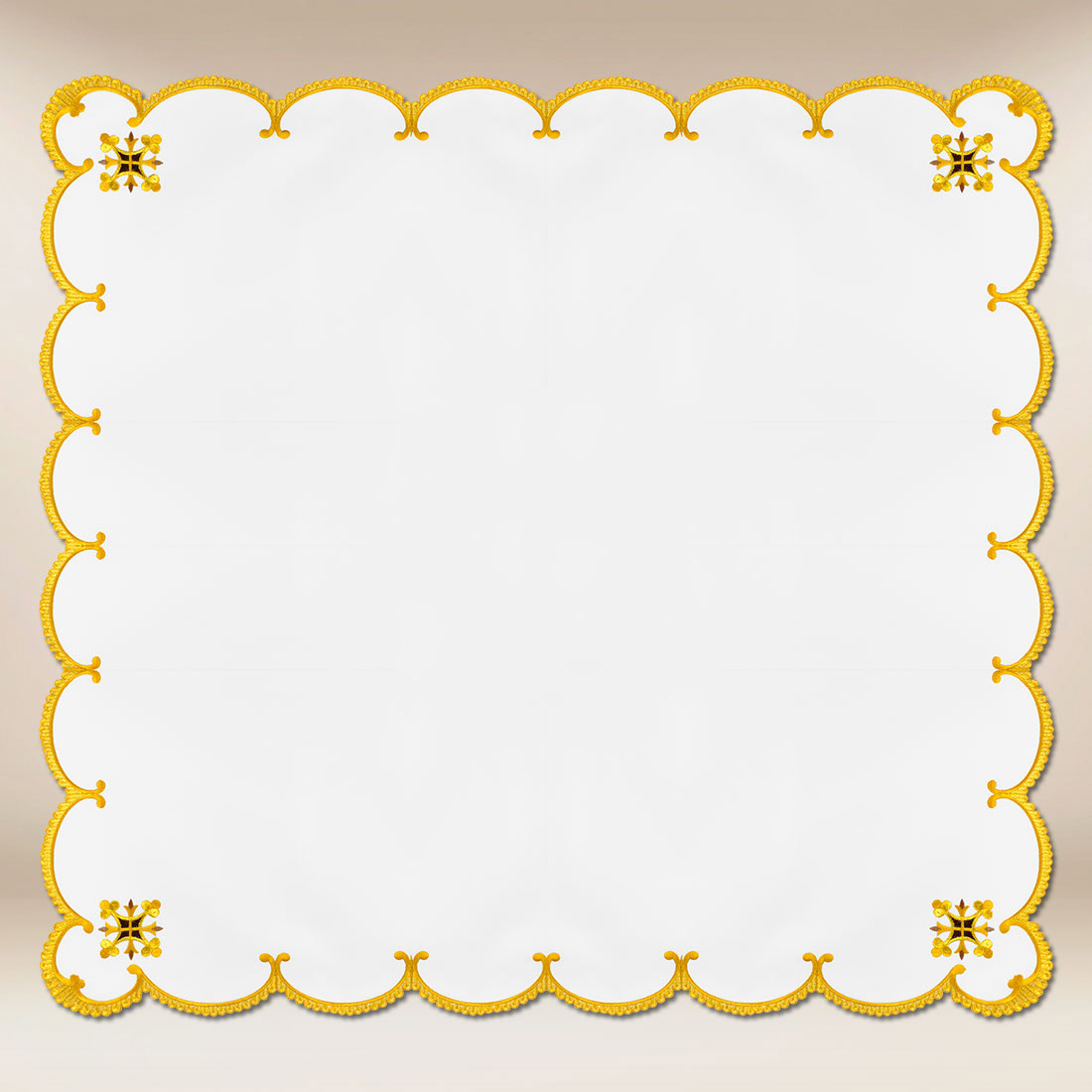Serwetka została wykonana z wysokiej jakości poliestru, tkaniny gładkiej i impregnowanej, odpornej na zabrudzenia oraz łatwej w pielęgnacji. Materiał ten gwarantuje trwałość oraz zachowanie estetycznego wyglądu nawet przy intensywnym użytkowaniu w warunkach liturgicznych. Precyzja wykonania widoczna jest w starannym wykończeniu krawędzi oraz klarowności detalu haftu.