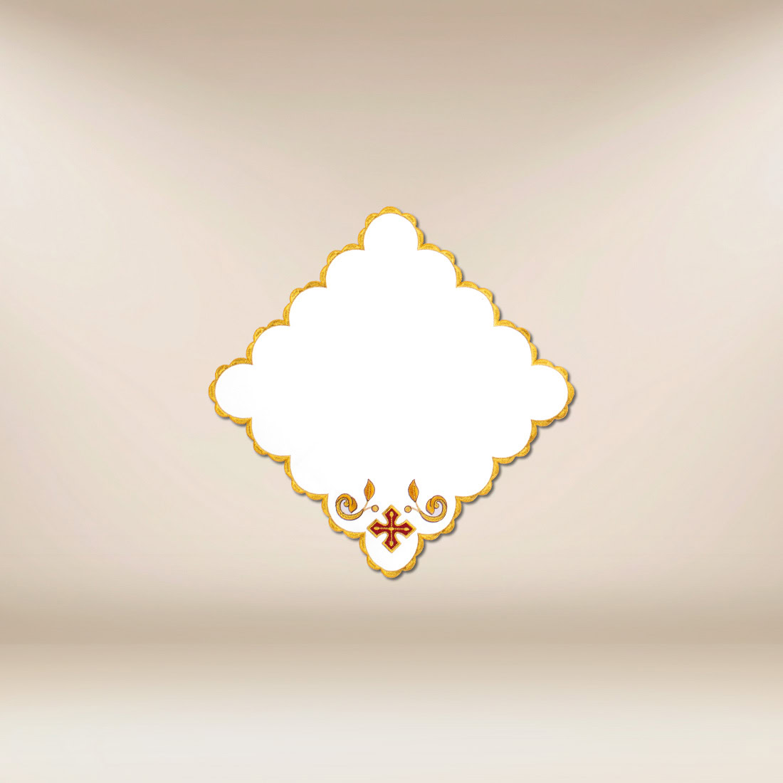 Produkt wykonany został z wysokiej jakości tkaniny poliestrowej, impregnowanej i plamoodpornej, co zapewnia trwałość oraz wygodę użytkowania w warunkach liturgicznych. Precyzyjnie opracowany haft podkreśla dbałość o detale i estetykę wykończenia, dzięki czemu serwetka zachowuje swój elegancki wygląd przez długi czas. Rozmiar 32×32 cm sprawia, że jest to praktyczny i uniwersalny dodatek do wystroju ołtarza.