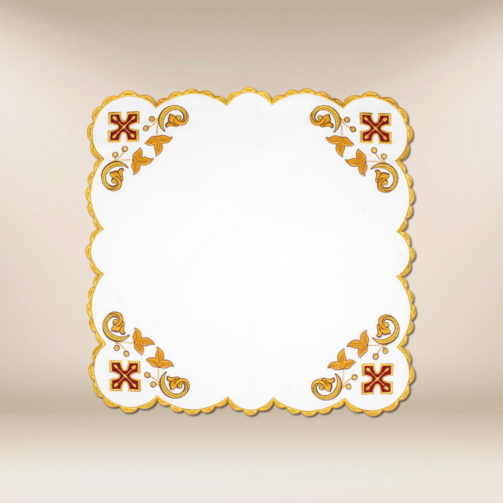 Centralnym motywem serwetki jest symbol Baranka Bożego, który od wieków odnosi się do ofiary Chrystusa i tajemnicy zbawienia. Subtelna kompozycja haftu zachowuje równowagę między dekoracyjnością a powagą liturgii, nie dominując przestrzeni, lecz ją dopełniając. To sprawia, że serwetka jest odpowiednia zarówno na okres zwykły, jak i na uroczystości eucharystyczne.