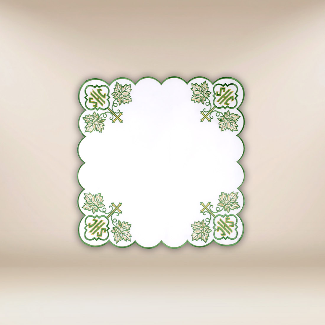 Serwetka haftowana „IHS Zielony” 45×45 to starannie zaprojektowany element tekstyliów liturgicznych, przeznaczony do godnej i harmonijnej oprawy ołtarza. Większy format sprawia, że motyw haftowany jest wyraźnie widoczny, a całość prezentuje się dostojnie i szykownie w przestrzeni prezbiterium.