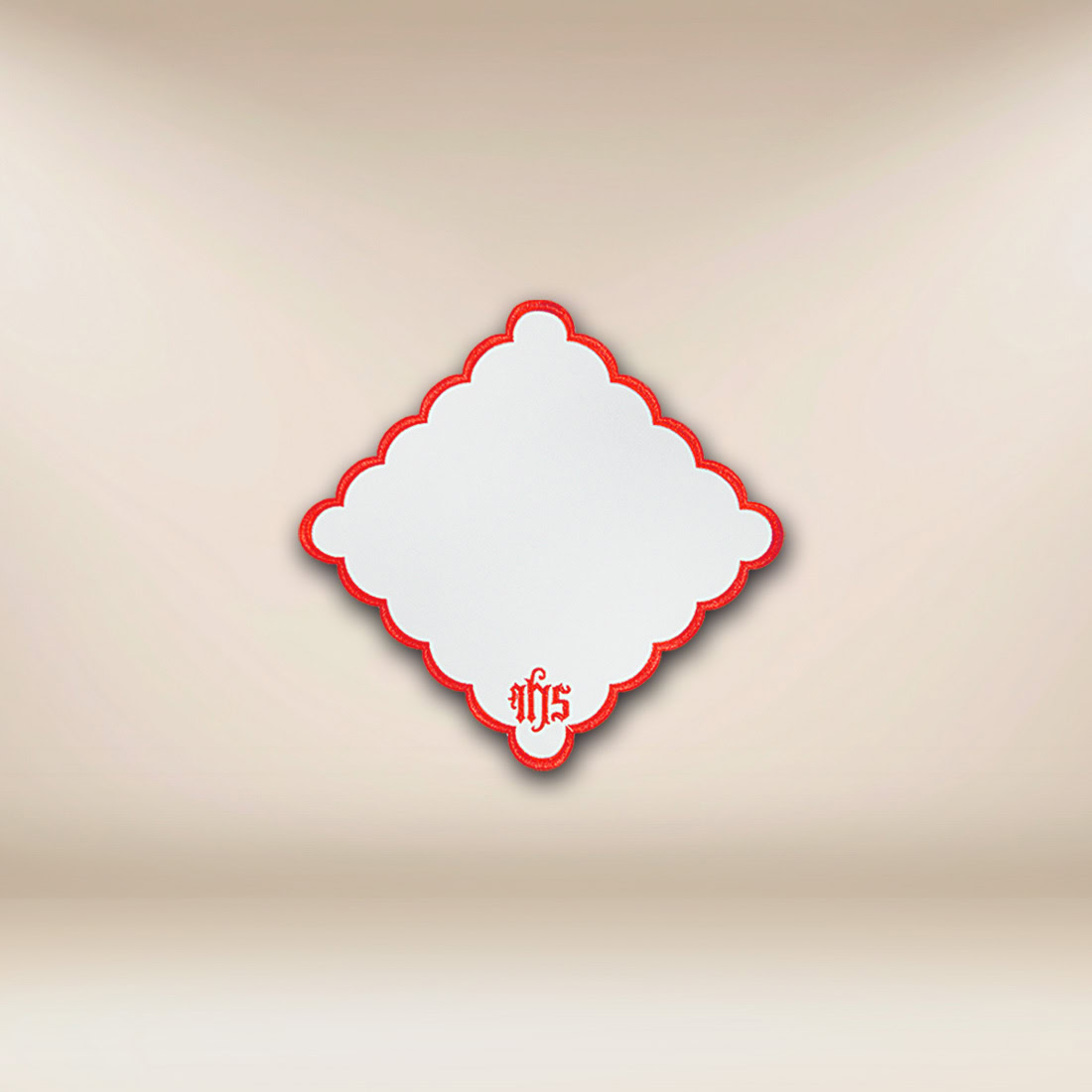 Motyw katedralny w połączeniu z haftowanym monogramem IHS stanowi czytelne nawiązanie do Chrystusa obecnego w Eucharystii. Czerwony haft symbolizuje ofiarę, miłość i żar wiary, co czyni serwetkę szczególnie odpowiednią na uroczyste celebracje, wspomnienia męczenników oraz Msze o podniosłym charakterze. Ornament umieszczony centralnie zachowuje liturgiczną prostotę, nie dominując przestrzeni, lecz podkreślając jej sakralny wymiar. Serwetka haftowana „Katedralny” Czerwona 32×32 doskonale wpisuje się w estetykę klasycznych wnętrz sakralnych.