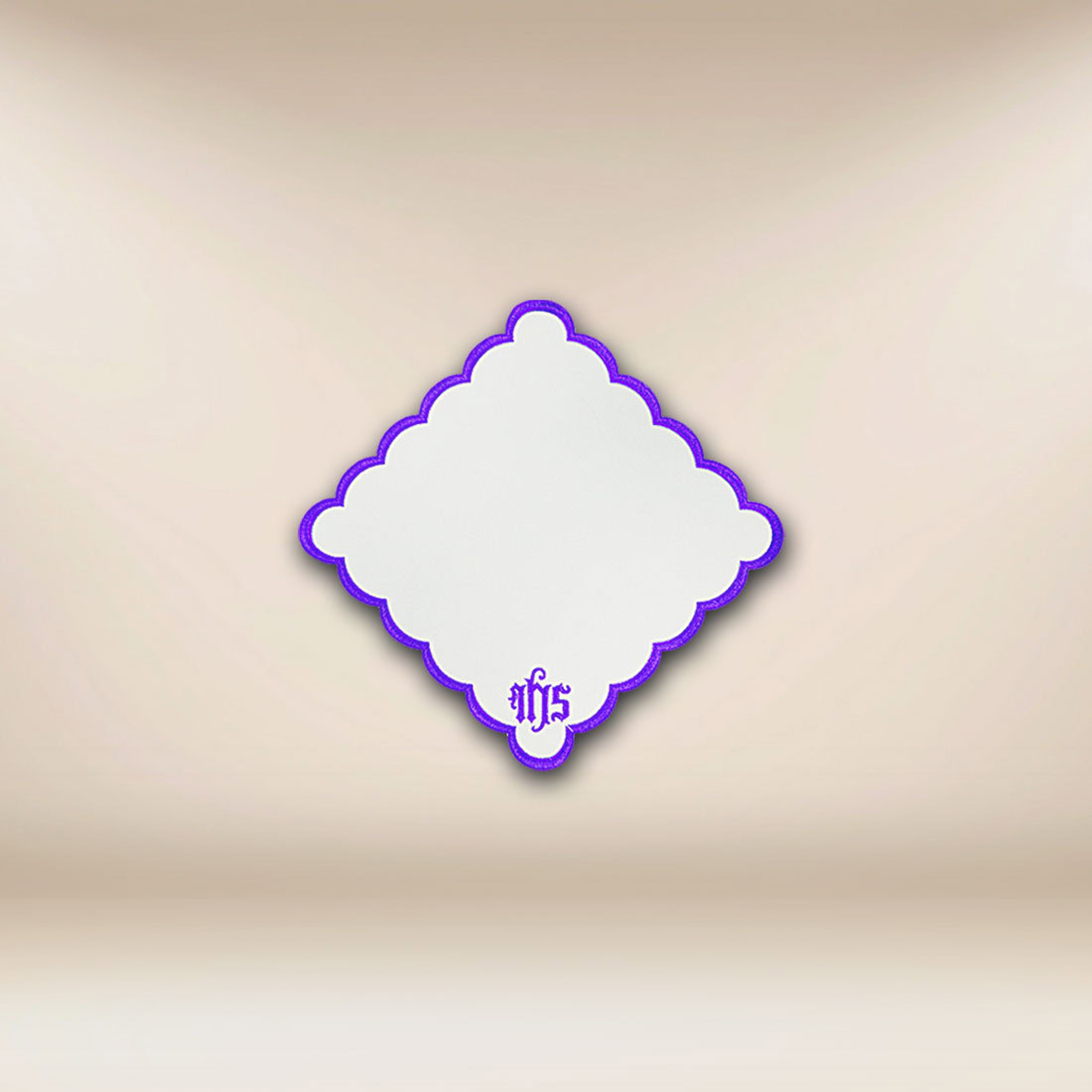 Model zdobiony subtelnym haftem w kolorze fioletowym harmonijnie wpisuje się w symbolikę okresu pokuty, pomagając stworzyć atmosferę skupienia i modlitwy. Ozdobna linia wykończenia dodatkowo podkreśla estetykę serwetki, zachowując przy tym liturgiczną prostotę i godność.