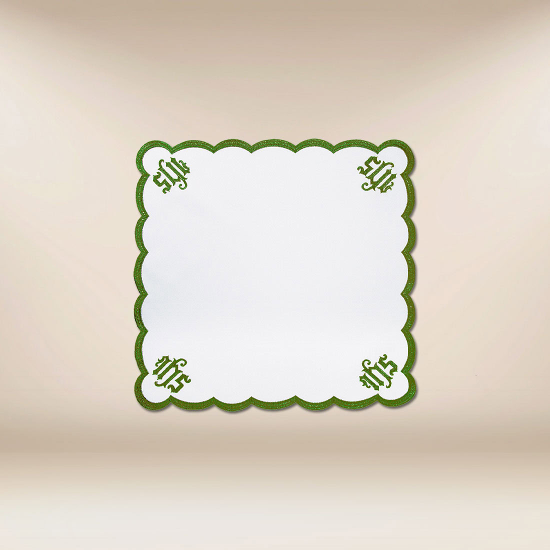 Charakterystycznym elementem zdobienia jest monogram IHS, jeden z najważniejszych symboli chrystologicznych, bezpośrednio odnoszący się do obecności Chrystusa w Eucharystii. Umieszczenie motywu w narożnikach nadaje kompozycji równowagę i porządek, a jednocześnie subtelnie podkreśla sakralny charakter serwetki. Forma zdobienia inspirowana architekturą katedralną łączy prostotę z wyrafinowaną elegancją, sprzyjając skupieniu i modlitwie.