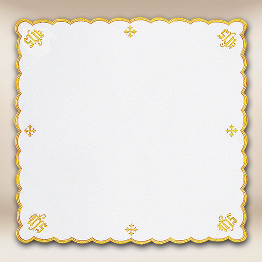 Symbol IHS umieszczony w narożach jest jednym z najstarszych chrystogramów, niosąc znaczenie związane z imieniem Jezusa. Delikatnie haftowany złotą nicią wprowadza subtelny blask, który nie dominuje, lecz dopełnia aranżację ołtarza. Dzięki temu serwetka pięknie prezentuje się zarówno podczas codziennej Mszy świętej, jak i w czasie uroczystości parafialnych, świąt oraz adoracji.