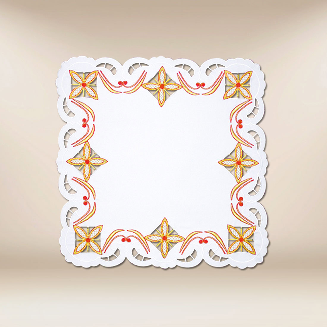 Serwetka haftowana liturgiczna „Krzyże w Kwadracie” 45×45 to starannie zaprojektowany element tekstyliów ołtarzowych, którego piękna kompozycja łączy klasyczną symbolikę liturgiczną z dekoracyjną finezją. Delikatne wycięcia brzegowe, charakterystyczne falowanie tkaniny oraz kolorowe hafty przedstawiające krzyże wpisane w kwadratowe pola tworzą harmonijną i wyrazistą oprawę dla celebracji eucharystycznych. Serwetka haftowana liturgiczna podkreśla uroczysty charakter Mszy świętej i stanowi subtelny, lecz zauważalny akcent w przestrzeni sakralnej.