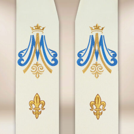 Serweta zdobiona jest złotym haftem Maryjnym, inspirowanym klasycznymi motywami maryjnymi obecnymi w sztuce sakralnej.