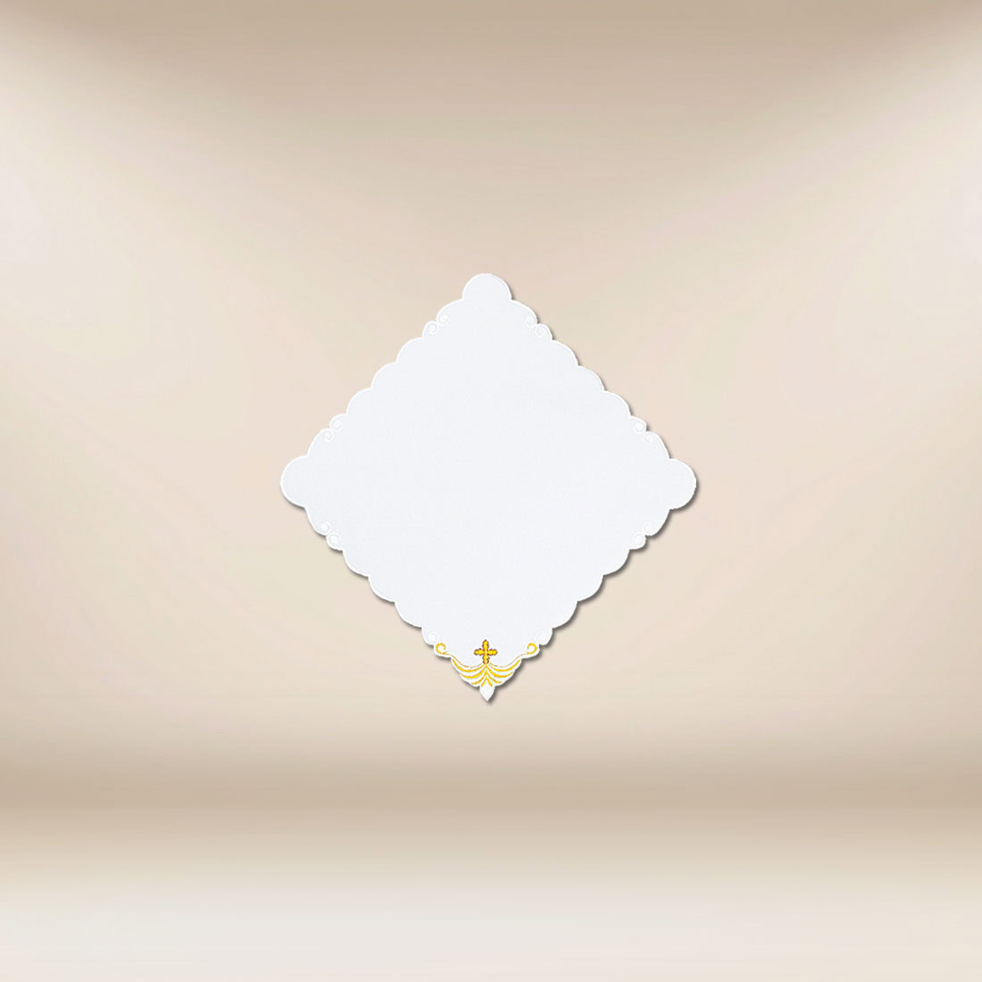 Serwetka haftowana o wymiarach 32cm × 32cm to elegancki element wystroju ołtarza, który łączy subtelność i liturgiczne piękno. Wykonana z wysokiej jakości białej tkaniny poliestrowej, zachowuje doskonały wygląd i formę nawet po wielu praniach. Delikatny złoty haft, umieszczony wokół brzegów serwety, nadaje jej wyjątkowy charakter, podkreślając uroczysty nastrój liturgii i duchową głębię przestrzeni sakralnej.