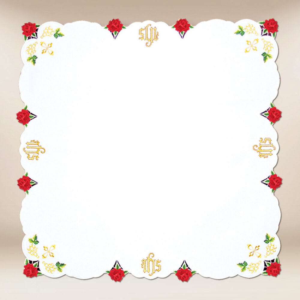 W centralnej części serwetki znajduje się haftowany chrystogram IHS otoczony delikatnym motywem róż. Symbol IHS, od wieków obecny w sztuce sakralnej, wskazuje na obecność Chrystusa w Najświętszym Sakramencie i stanowi wyraz czci wobec Eucharystii. Wzór róż dopełnia kompozycję, wnosząc element czystości, duchowej miłości i wyciszenia. Połączenie tych symboli nadaje serwetce charakter podniosły, a jednocześnie harmonijny.