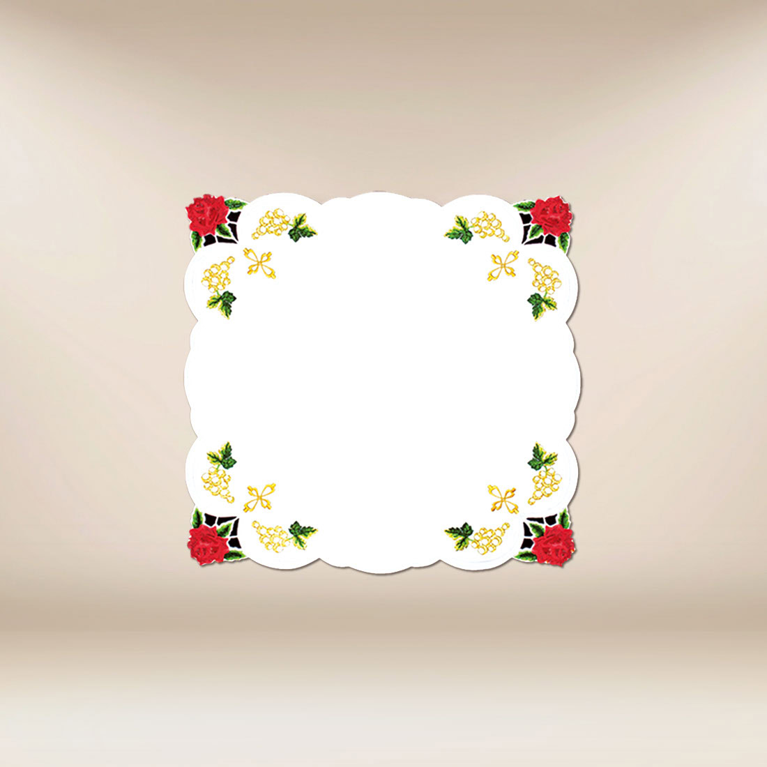 Subtelny motyw róż dodaje jej wyjątkowego charakteru. Róża, symbol czystości, duchowej miłości oraz poświęcenia, od wieków obecna jest w ikonografii i sztuce sakralnej. Wprowadzenie tego motywu na serwetce ołtarzowej podkreśla sakralny wymiar przestrzeni oraz wprowadza łagodną, harmonijną dekorację, która nie dominuje ołtarza, lecz harmonizuje z nim w sposób naturalny i estetyczny. Wzór został opracowany tak, aby pozostał delikatny, czytelny i stosowny do liturgii.
